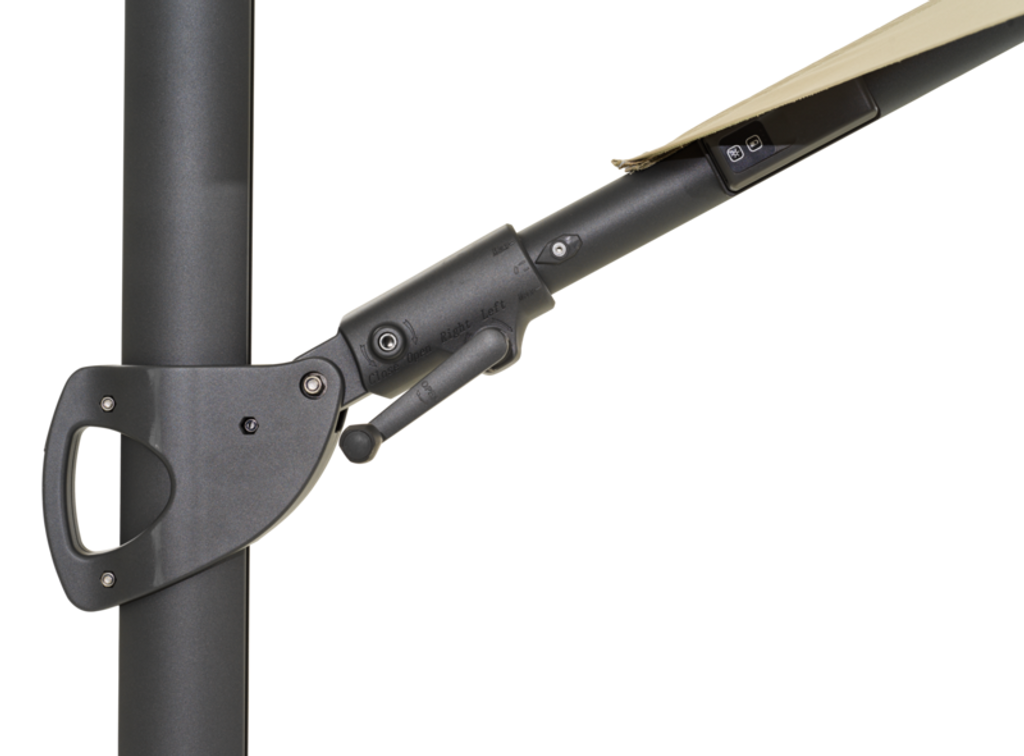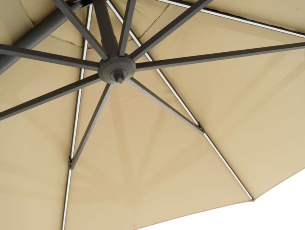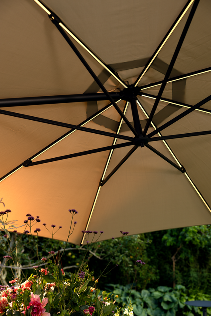 Den stilrena khaki-färgen ger en modern touch och smälter lätt in i olika trädgårdsmiljöer. Parasollet är utrustat med en vev, lutning och steglös kontroll, vilket gör det enkelt att justera efter solens position. Med ett knapptryck kan du aktivera den inbyggda belysningen som skänker ett mjukt och behagligt ljus utan att blända.