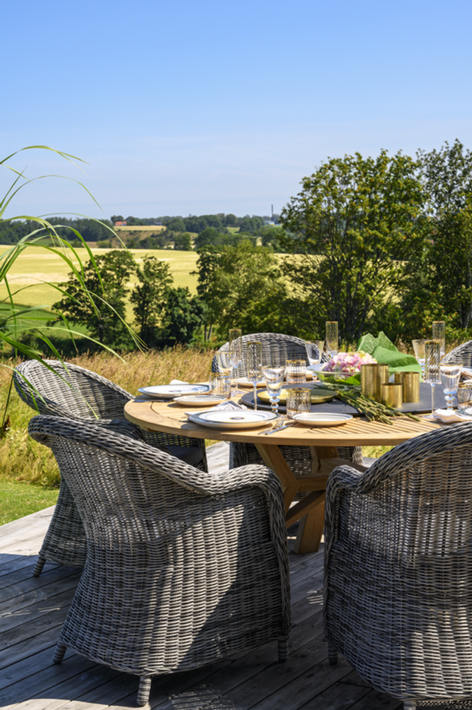 Robust och generöst teakbord med snurrskiva i superstone, perfekt för sociala måltider utomhus.