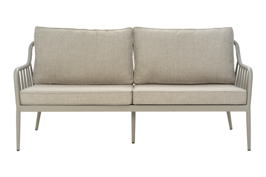 Elegant och bekväm 3-sits soffa för utomhusbruk med pulverlackerad aluminium och slitstarka olefindynor.
