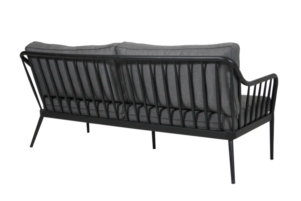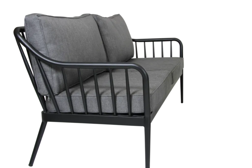 Elegant soffa i pulverlackerad aluminium med slitstarka olefindynor för långvarig komfort utomhus.