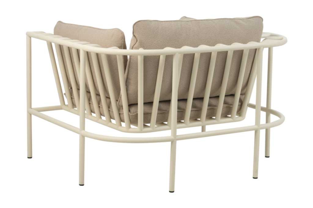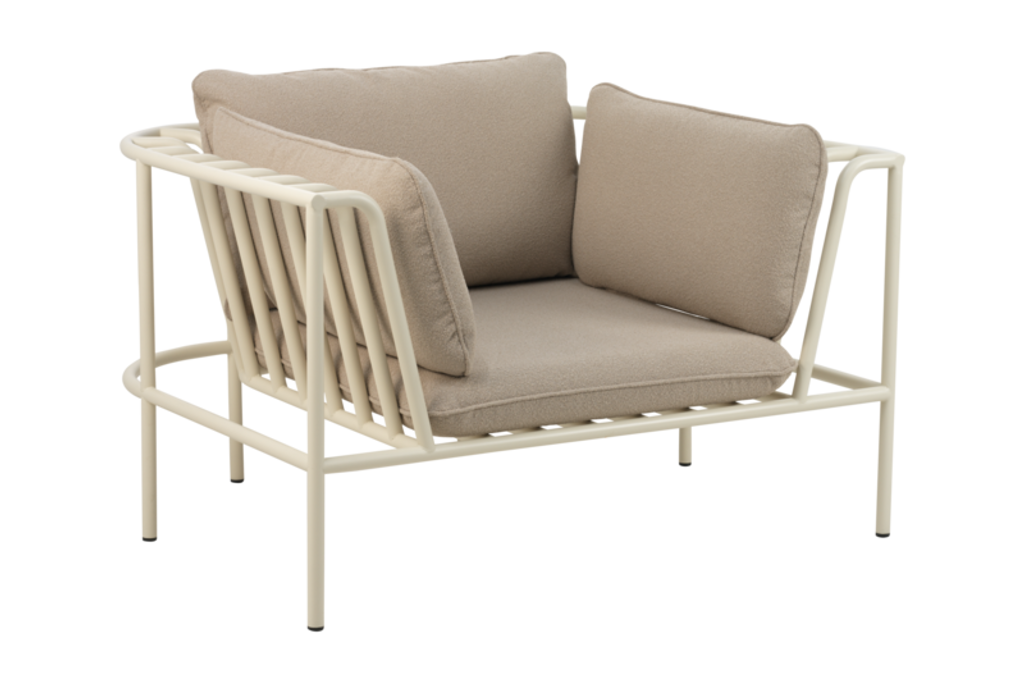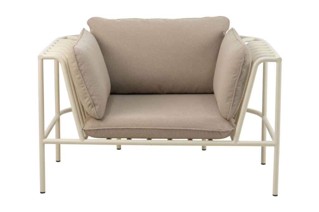 Elegant och flexibel fåtölj med böjda aluminiumrör och mjukt teddytyg, perfekt för anpassningsbara loungegrupper.