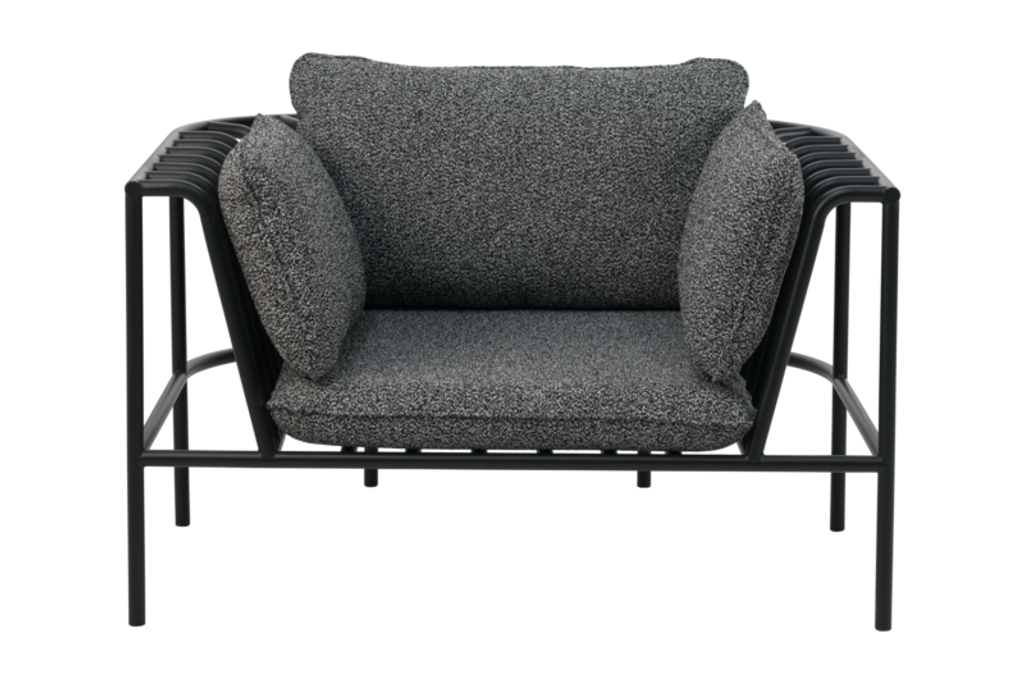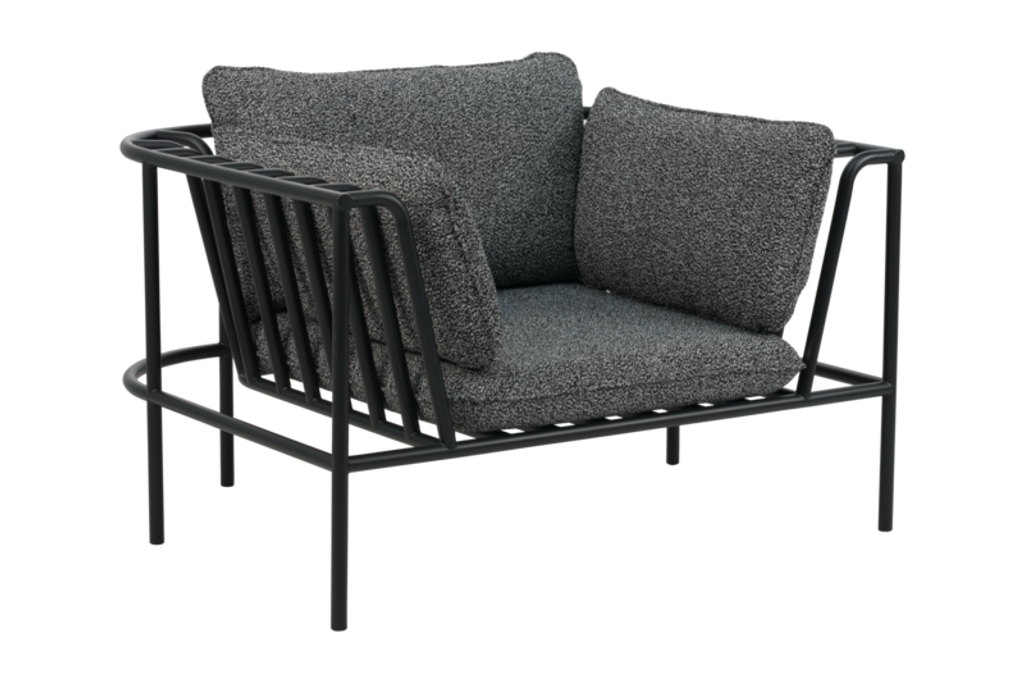 Elegant fåtölj i Collier-serien med kragliknande former och mjukt teddytyg, perfekt för flexibel loungegrupp.