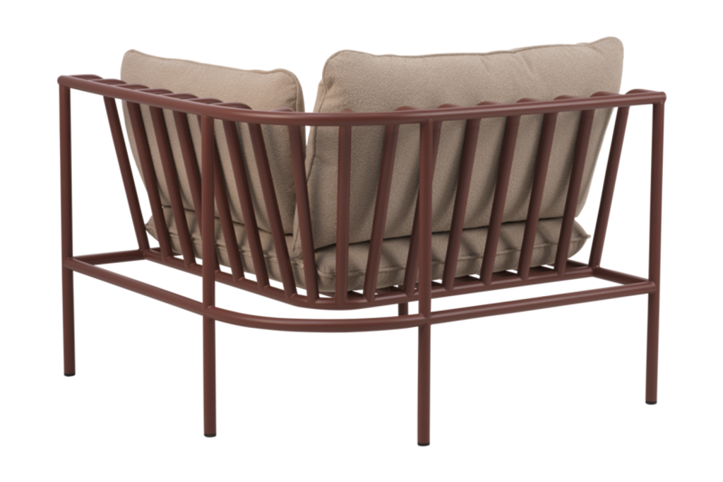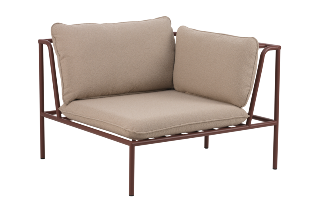 Upptäck Brafab Collier Hörndel Zin Röd / Teddy Beige, en del av den mångsidiga Collier-serien som låter dig bygga din egen loungegrupp. Denna hörnmodul utmärker sig med sina eleganta kragliknande former och mjukt, inbjudande teddytyg i en stilren beige nyans. Stommen är tillverkad av robust aluminium i en rik röd färg, vilket ger en modern och elegant känsla.