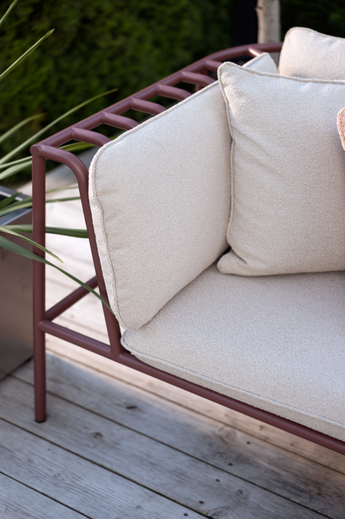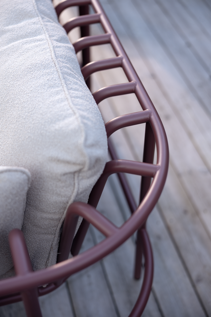 Den böjda formen på aluminiumramen inte bara tillför en visuell elegans, utan ger också extra komfort och stabilitet. Med material i återvunnen polyester är denna möbel både hållbar och ett miljövänligt val. Serien erbjuder även flera färgalternativ för både stomme och tyg, så att du kan anpassa din loungegrupp exakt efter din stil.