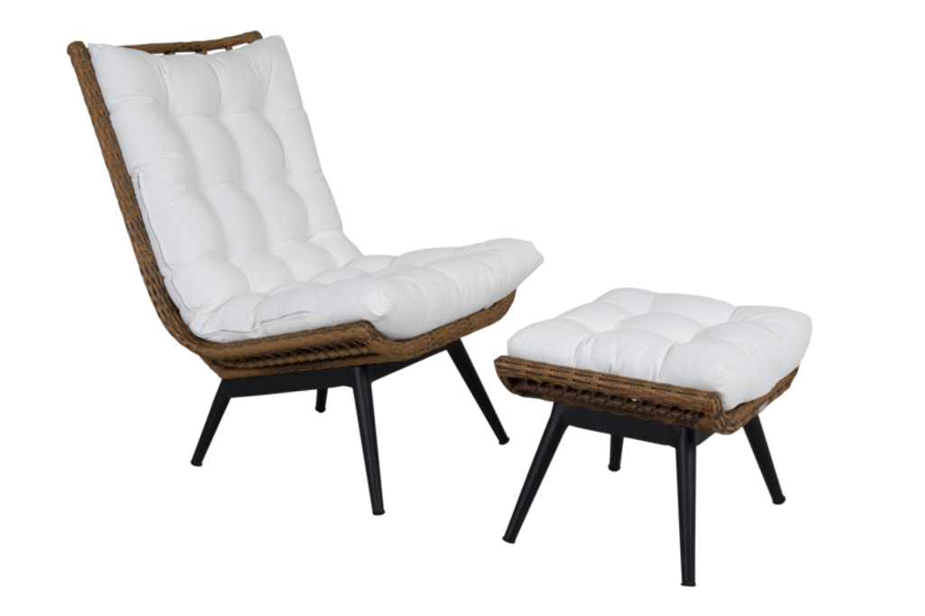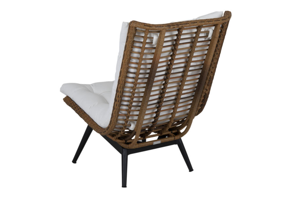 Modern loungefåtölj i konstrotting med vita olefindynor för stil och komfort, perfekt för uteplatsen.