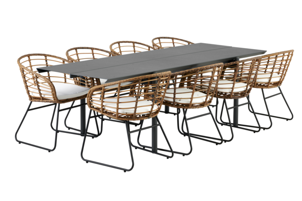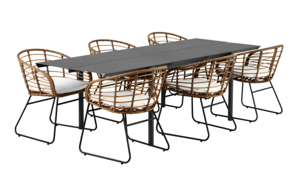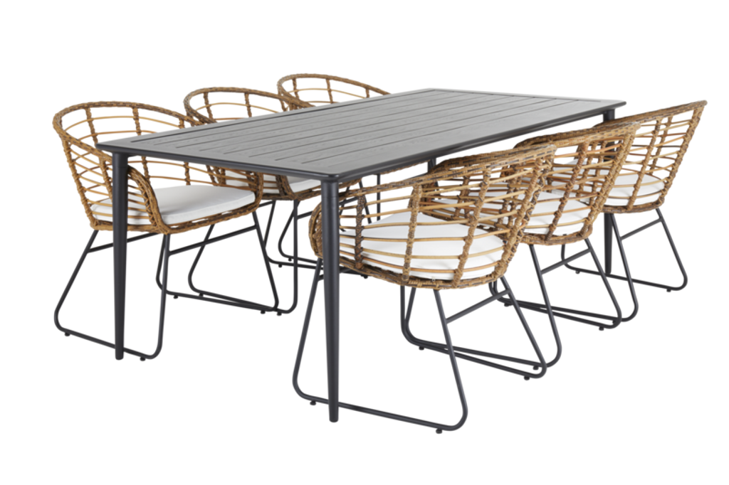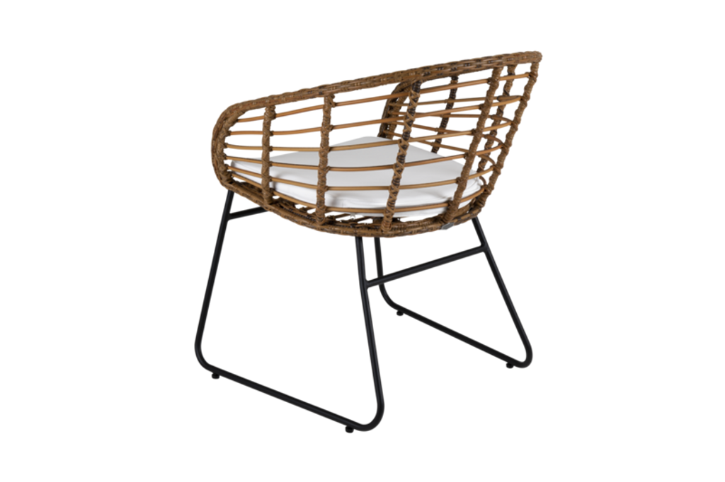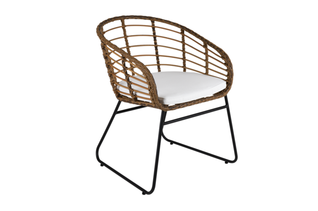 Covelo matstol från Brafab i naturfärgad konstrotting med vit dyna, erbjuder stil och komfort för din uteplats.