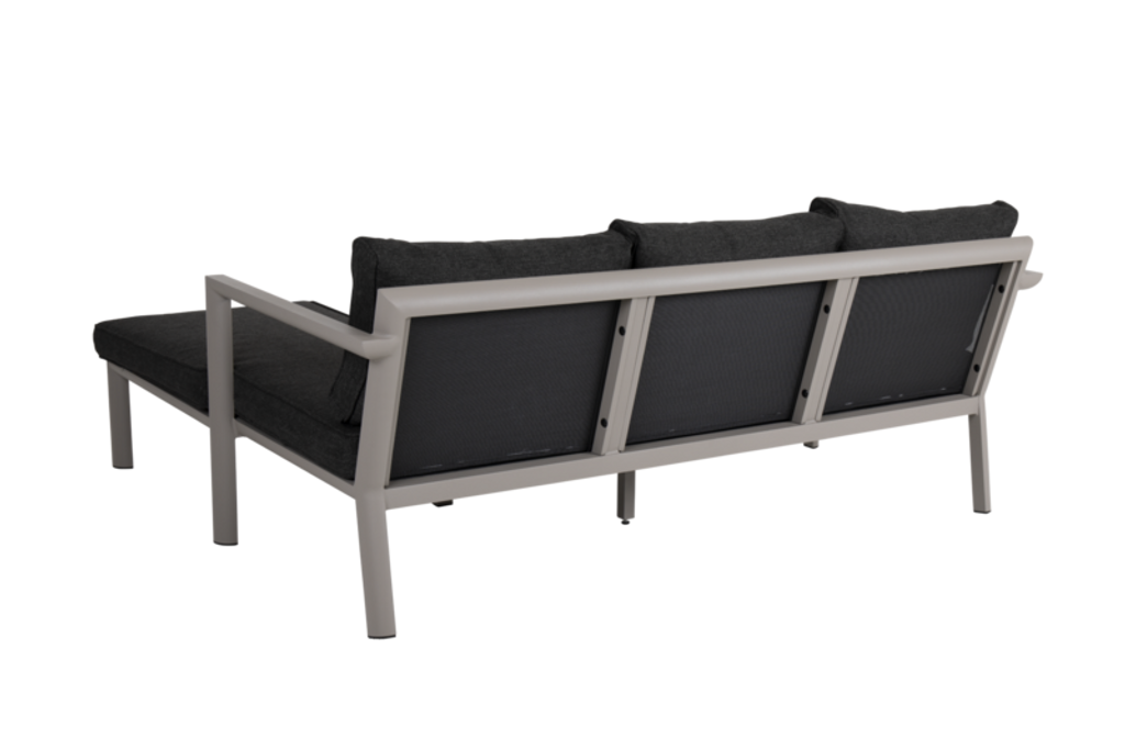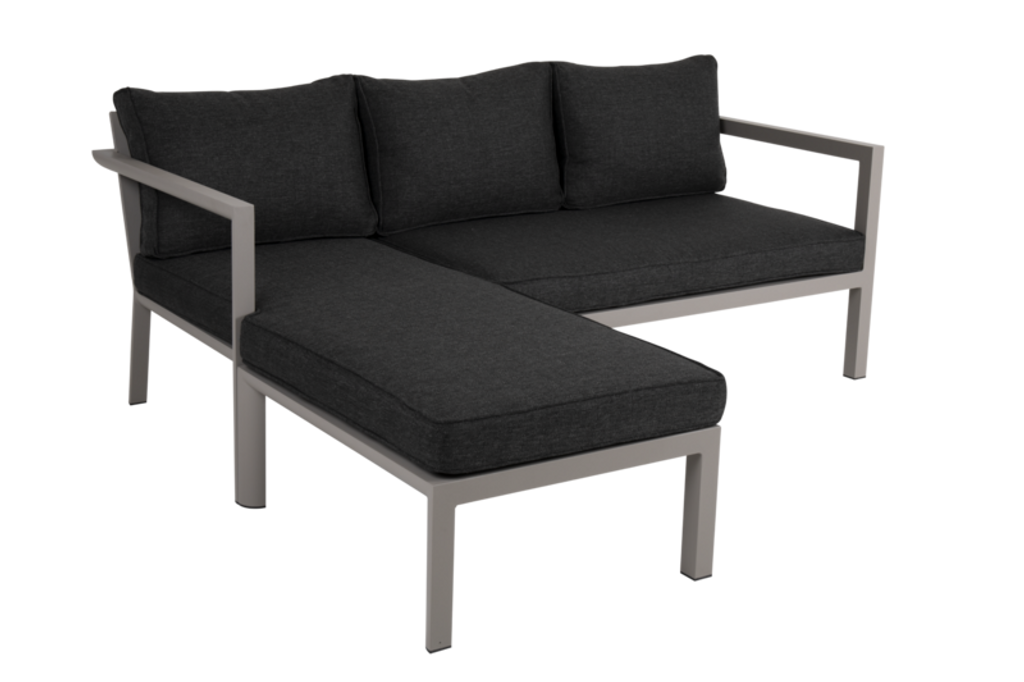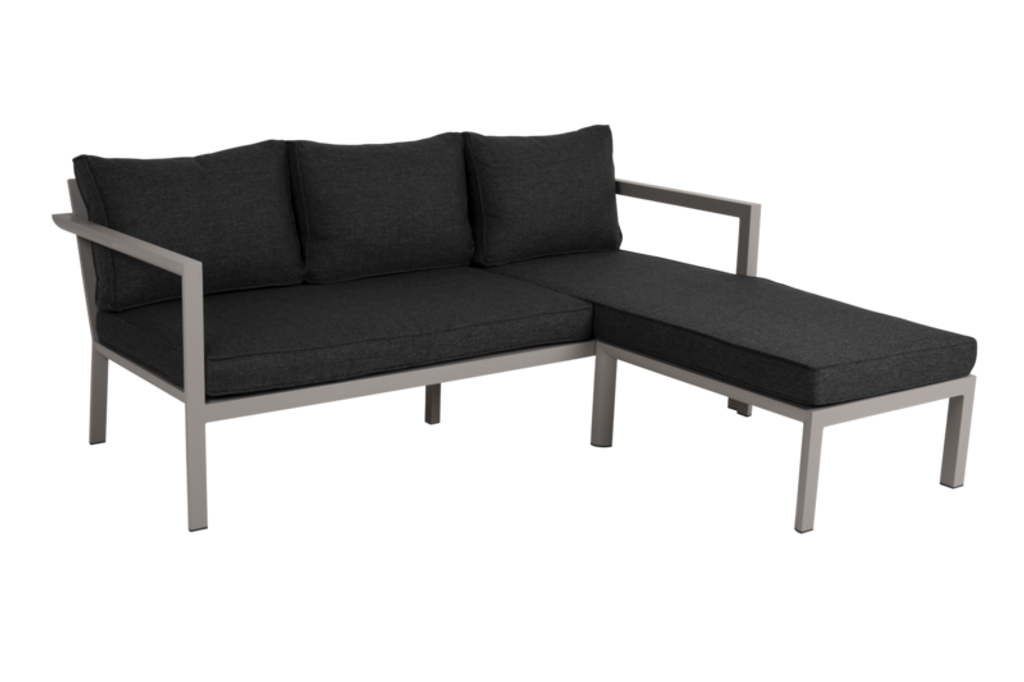 Stilren och flexibel divansoffa från Brafab i pulverlackerad aluminium med tåliga dynor, perfekt för små utrymmen.