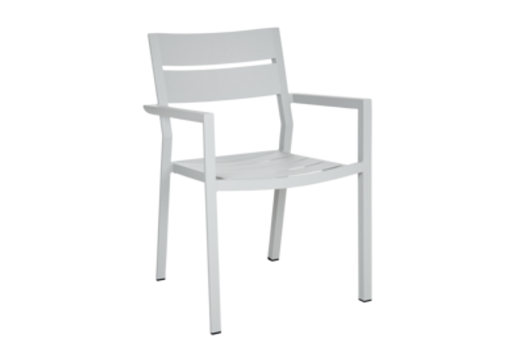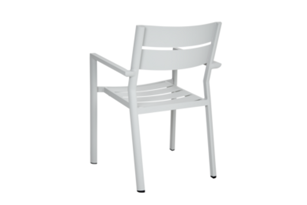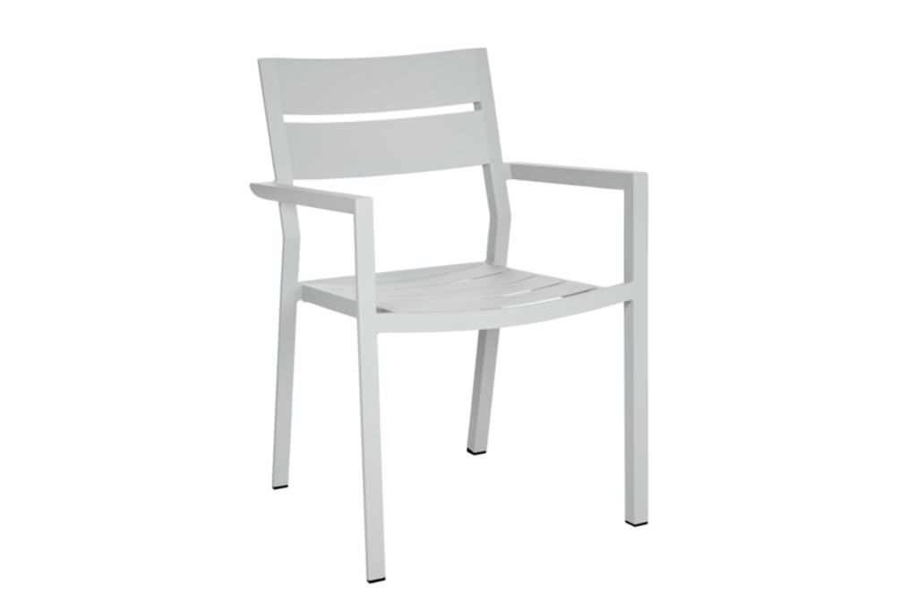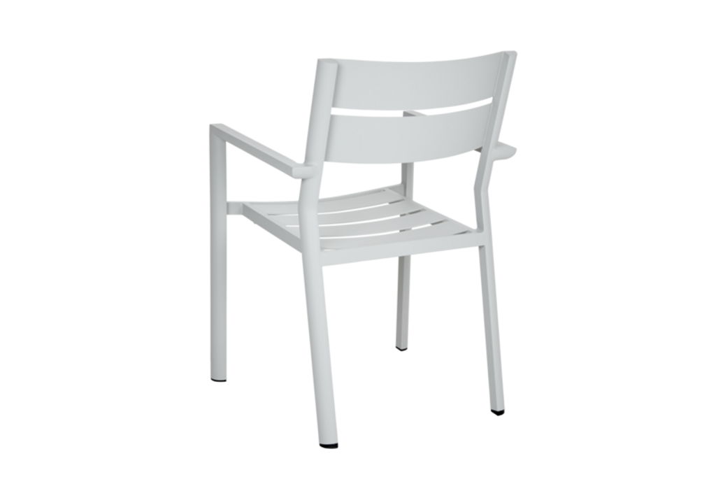 Delia karmstol är en stapelbar och stilren utomhusstol med pulverlackerad aluminiumstomme, perfekt för varierande miljöer.