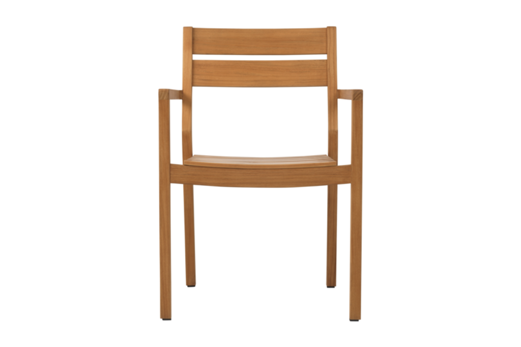Elegant karmstol i massivt teak med ergonomisk design och ikonisk silhuett för hög komfort och stil.