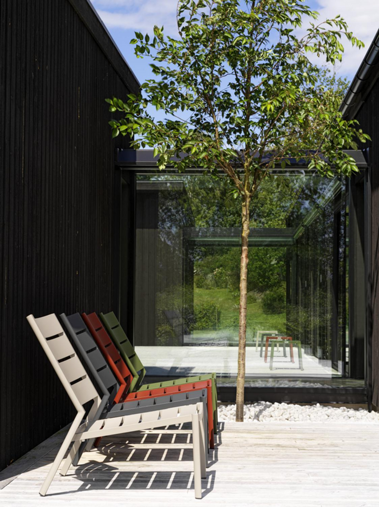 Modern och stilren loungefåtölj i khaki från Brafab, perfekt för uteplatser. Stapelbar och underhållsfri.