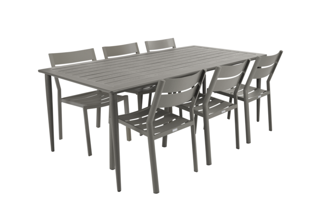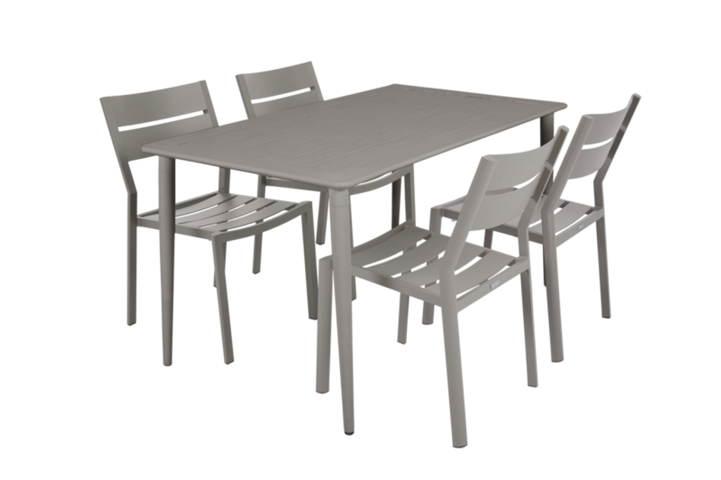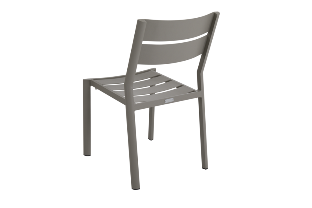 Modern och stapelbar matstol från Brafab i khaki. Perfekt för balkong och uteplats med minimal skötsel.