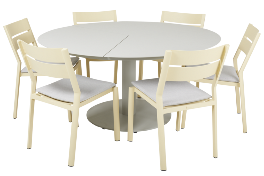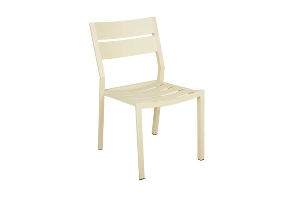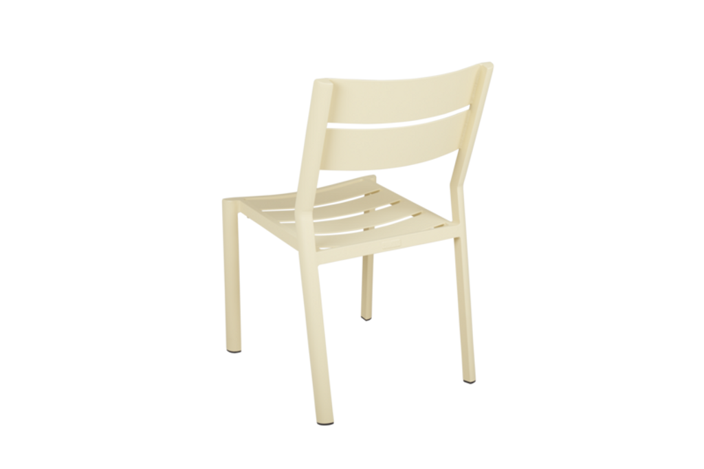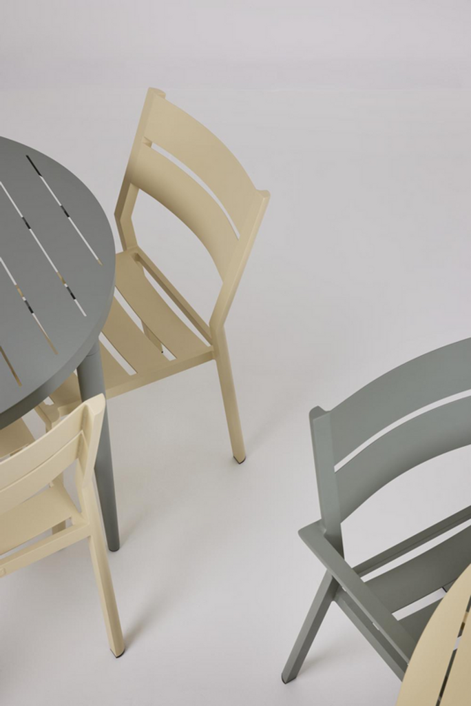 Delia matstol i citronfärgat aluminium är modern och stapelbar, perfekt för utomhusbruk.
