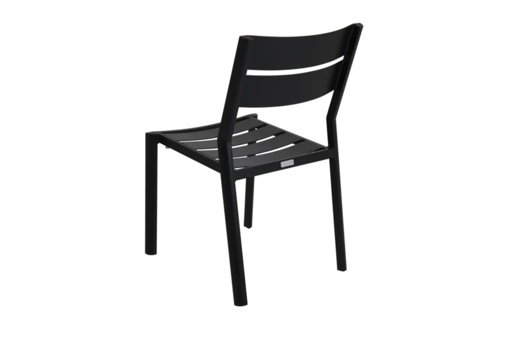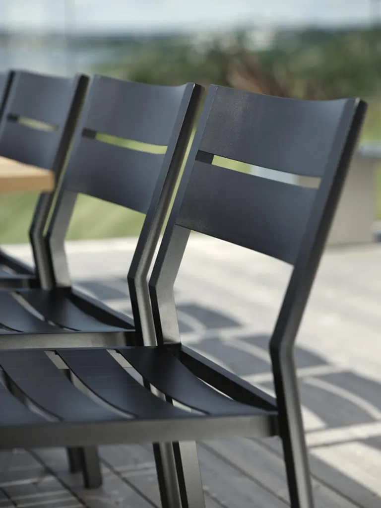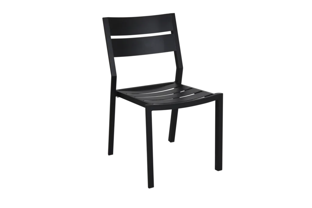Modern och stapelbar matstol i svart aluminium, perfekt för utomhusbruk med hög sittkomfort och lätt underhåll.