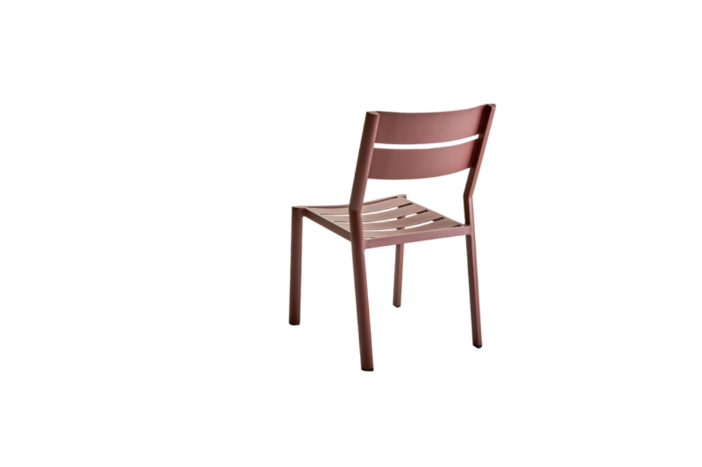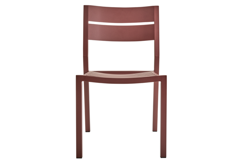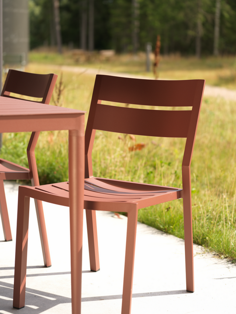 Färgstark och modern stapelbar matstol från Brafab i röd aluminium, perfekt för uteplatsen.