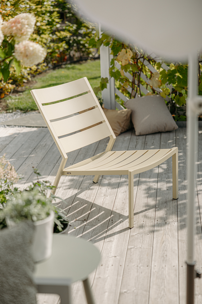 Modern och färgglad loungestol i aluminium, perfekt för balkong, uteplats eller trädgård.