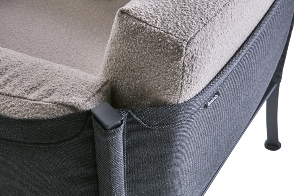 De klädda dynorna i bouclé-inspirerat solefin-tyg ger inte bara ett elegant utseende utan är också resistenta mot väder och vind, vilket gör dem lättskötta och långlivade. Soffans design, med sina följsamma sidor och generösa dimensioner, inbjuder till långa stunder av avkoppling och njutning.