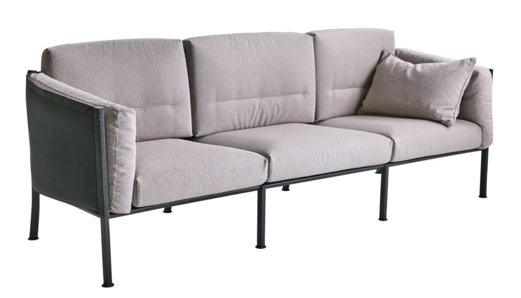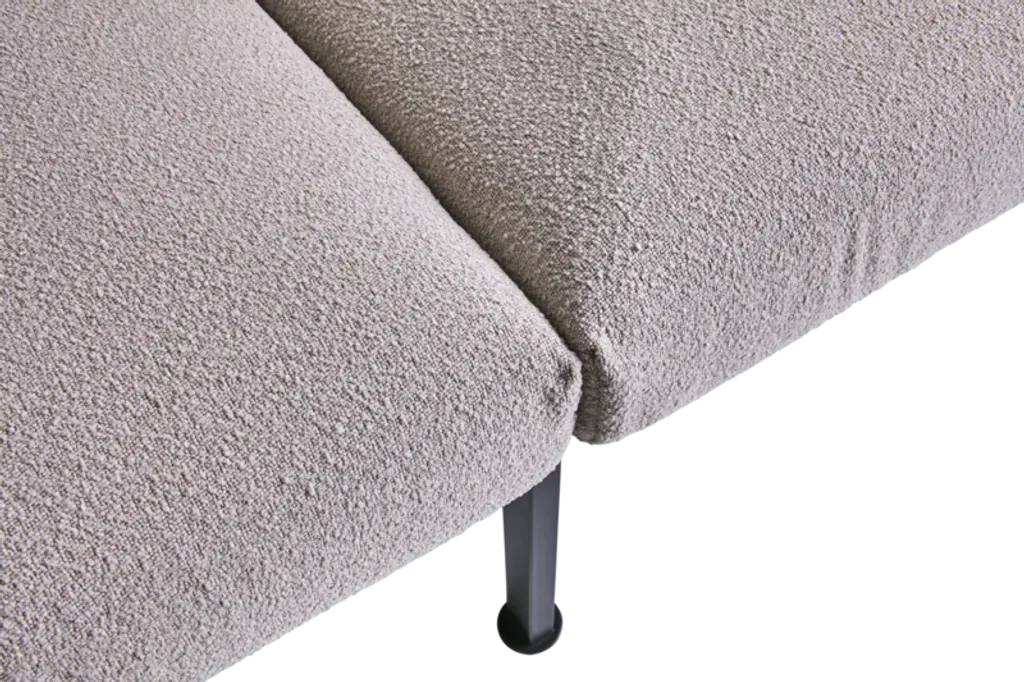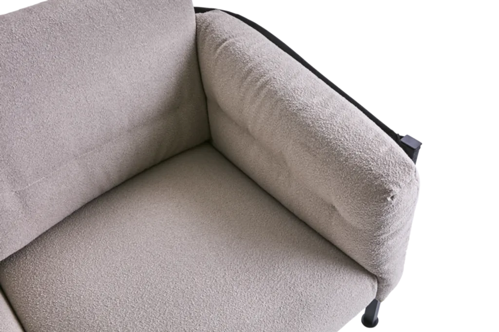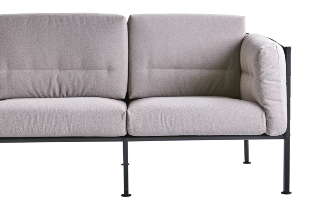 Delux-soffan kombinerar stil och komfort med en rostfri stålram och mjuka dynor i bouclé-inspirerat solefin-tyg.
