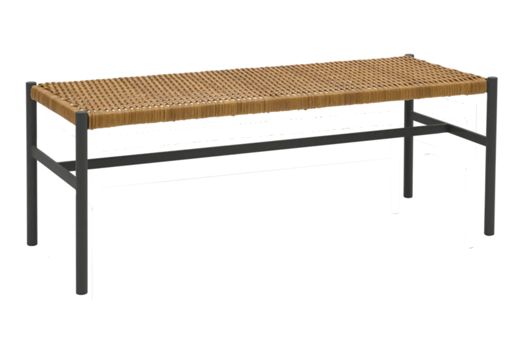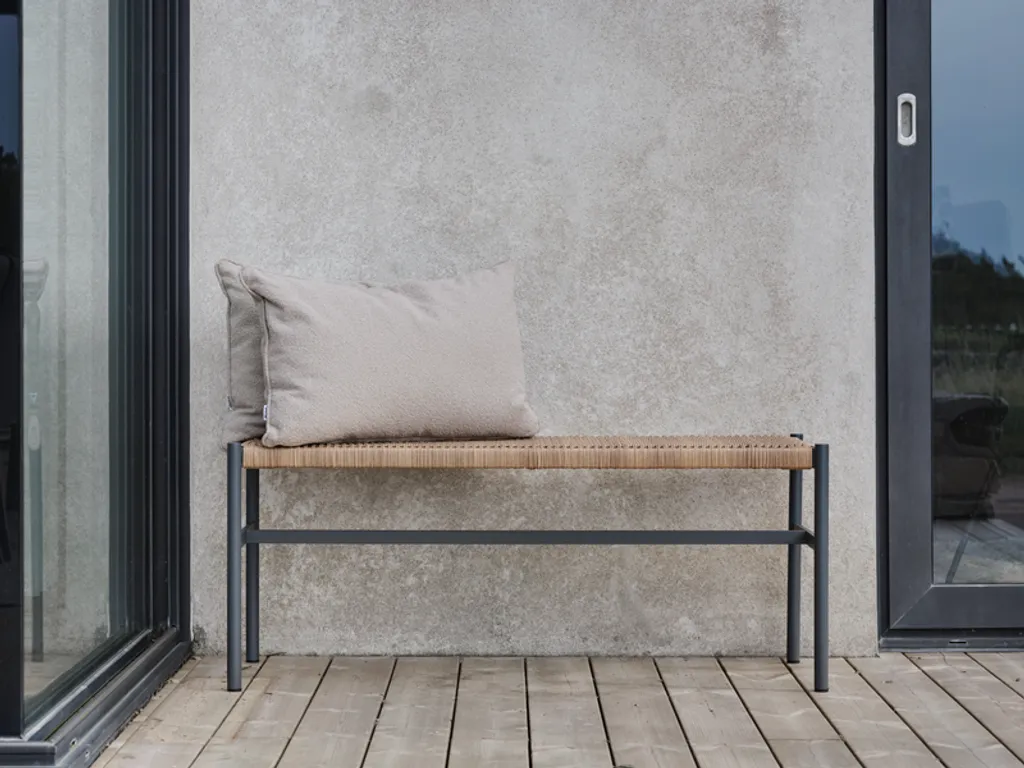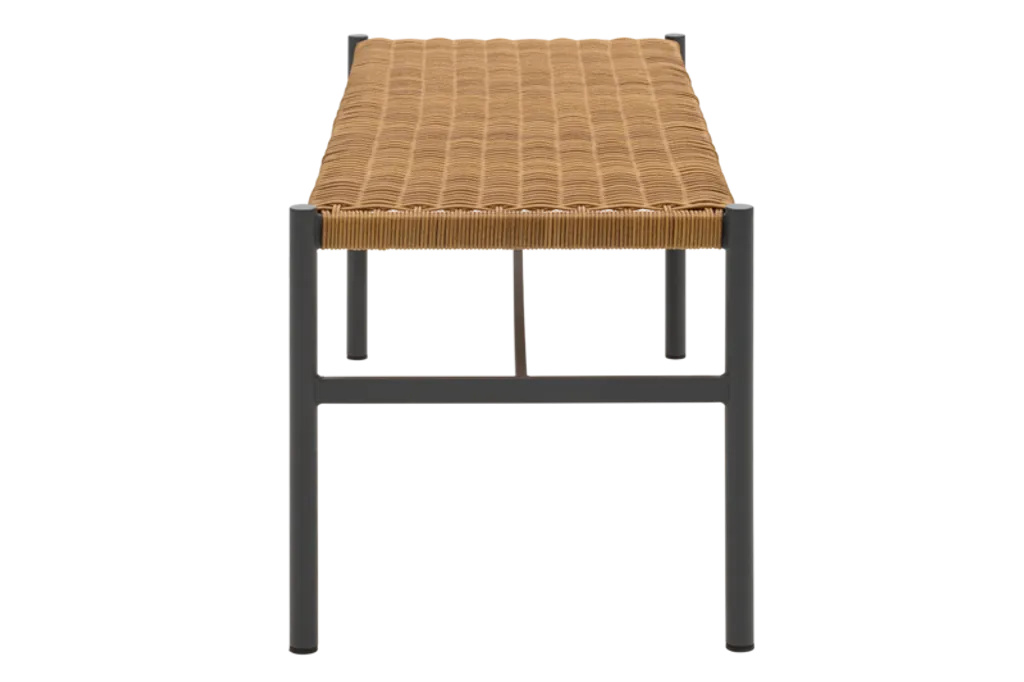 Den antracita färgen ger bänken ett stilrent och tidlöst utseende, medan den naturliga sitsvävningen skapar en varm atmosfär i ditt hem.