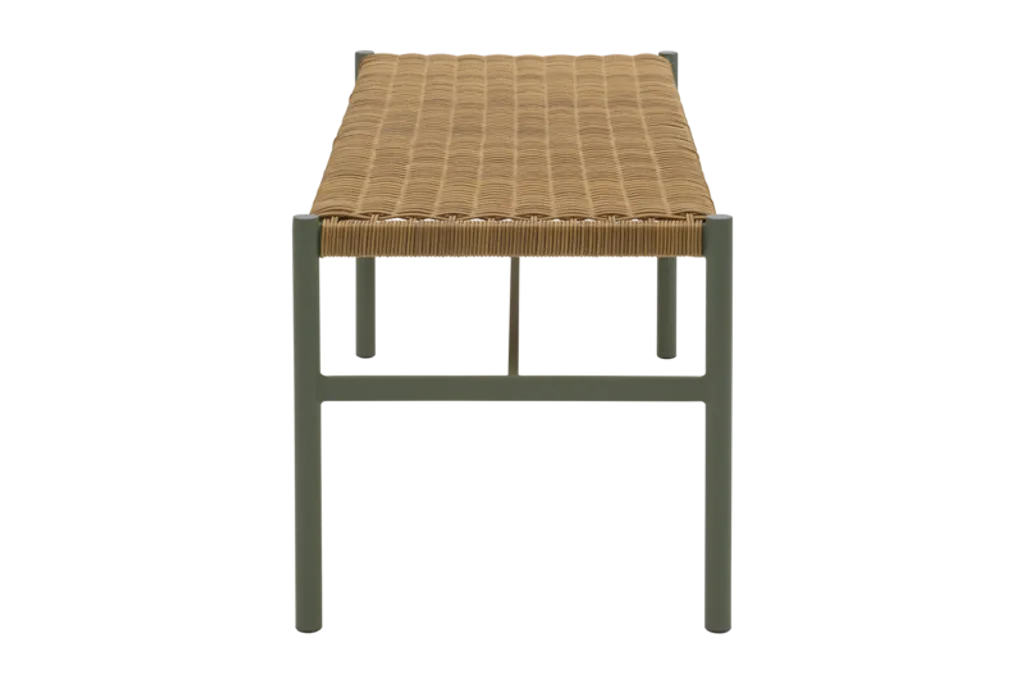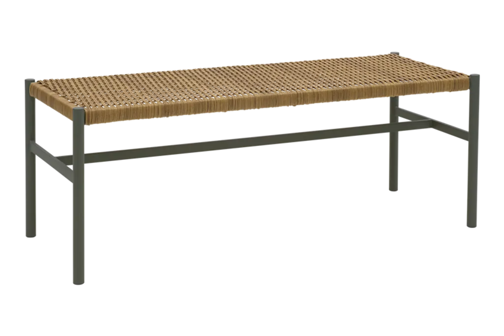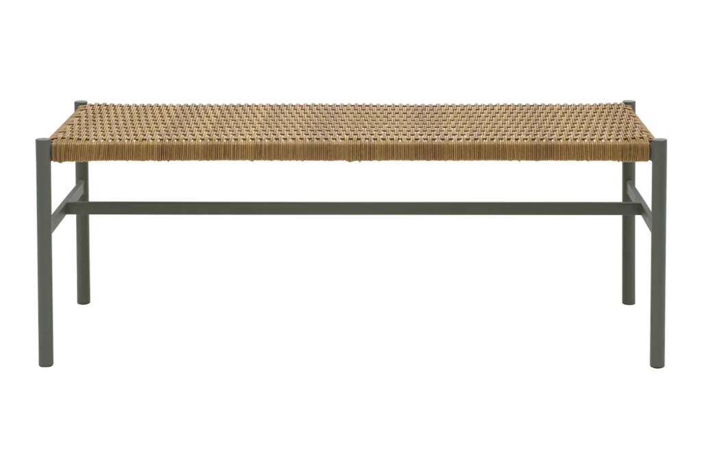 Bänkens ram är tillverkad av robust aluminium vilket gör den hållbar och lätt, perfekt för både inomhus och utomhusbruk. Den konstvävda sitsen ger komfort och stil, samtidigt som den är enkel att underhålla. Placera bänken mot en vägg eller i en öppen yta för att skapa en trivsam miljö.