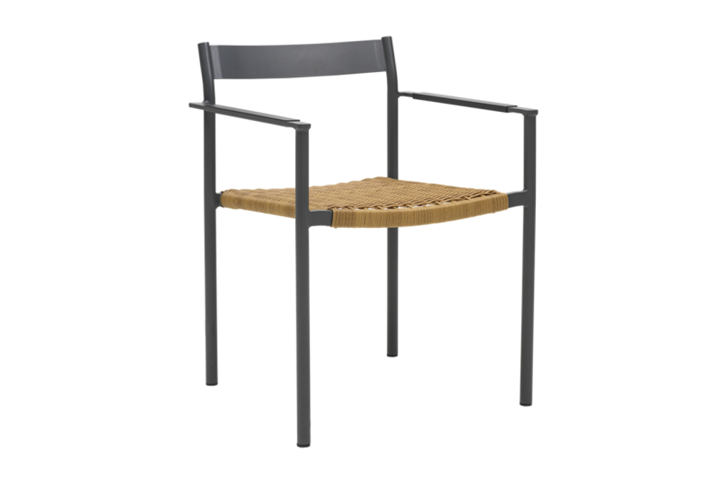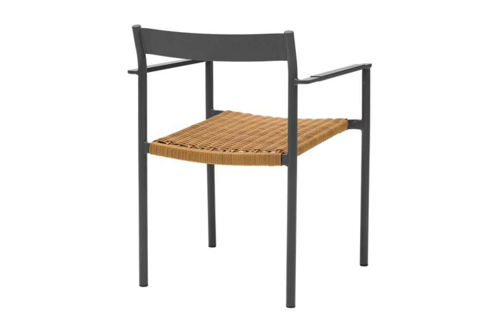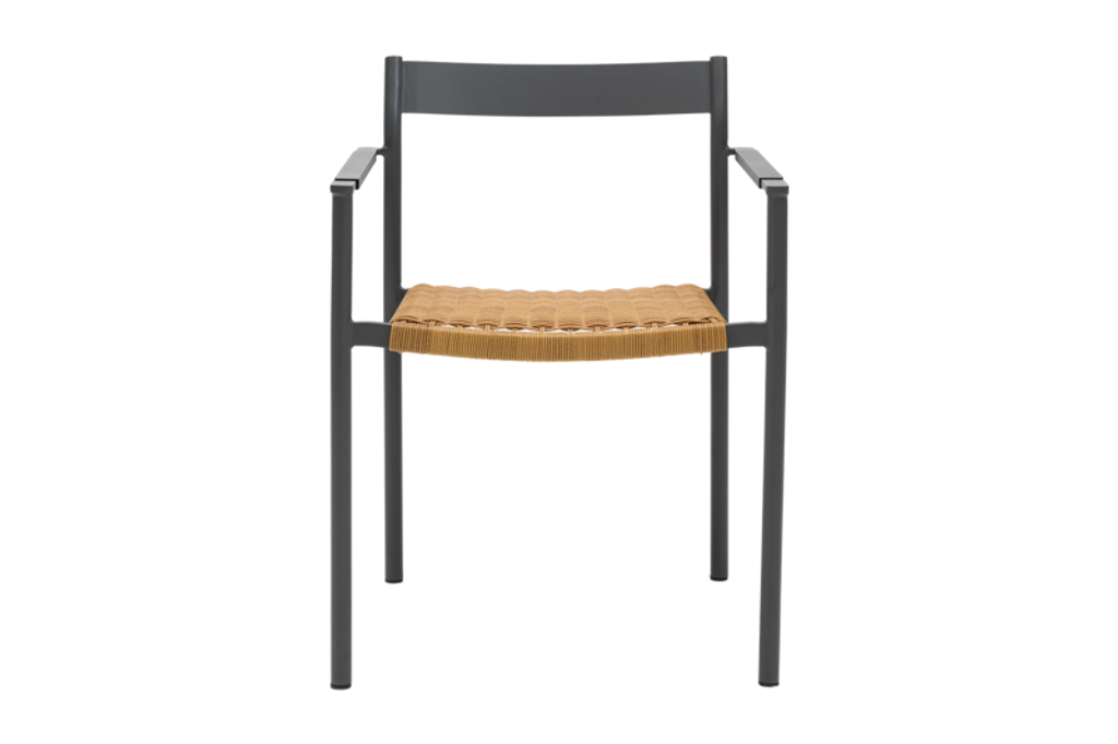Denna karmstol är tillverkad av högkvalitativ aluminium och konstrotting, vilket gör den både hållbar och lättskött. Dess stilrena grå färg kompletteras av den naturnära vävningen i sitsen, vilket gör den både elegant och tidlös. Tack vare dess stapelbara design är den också enkel att förvara när den inte används.
