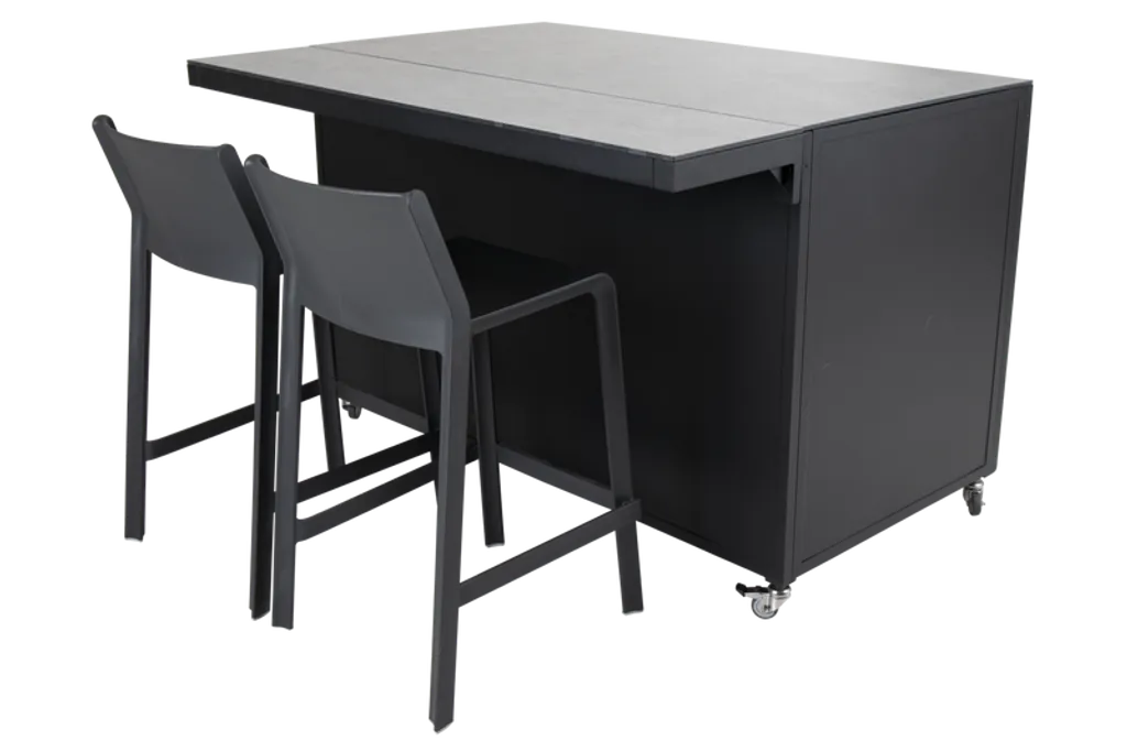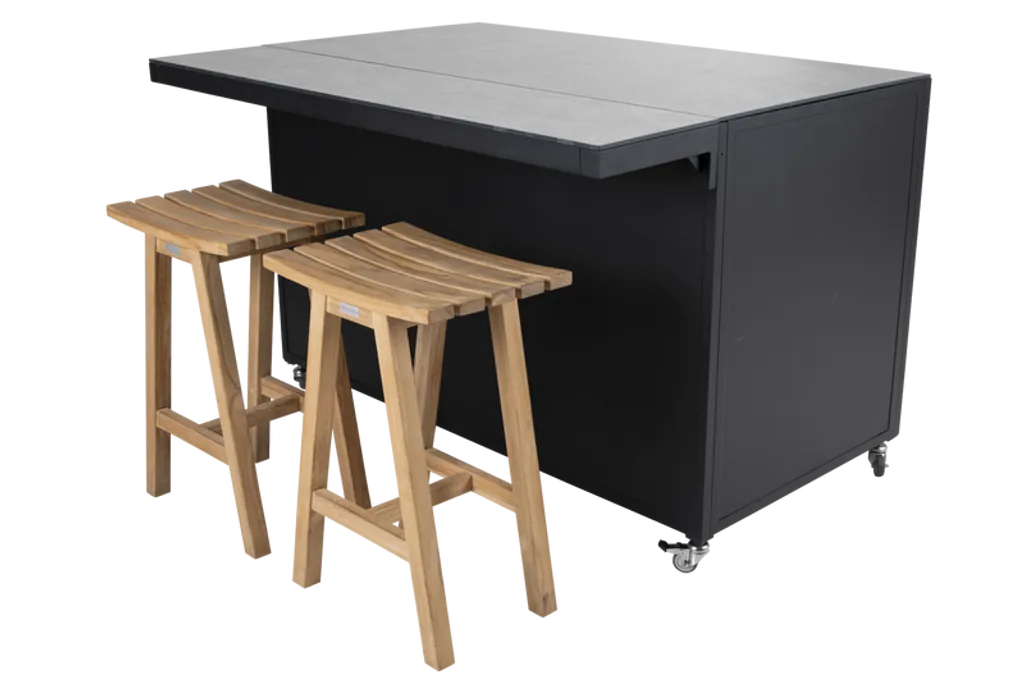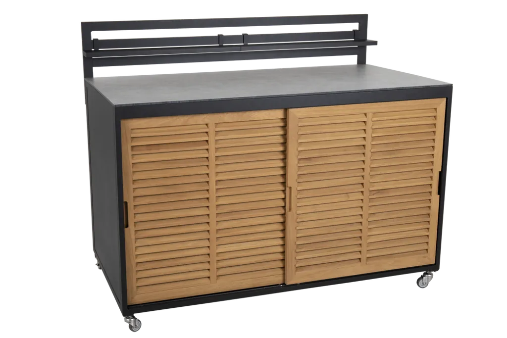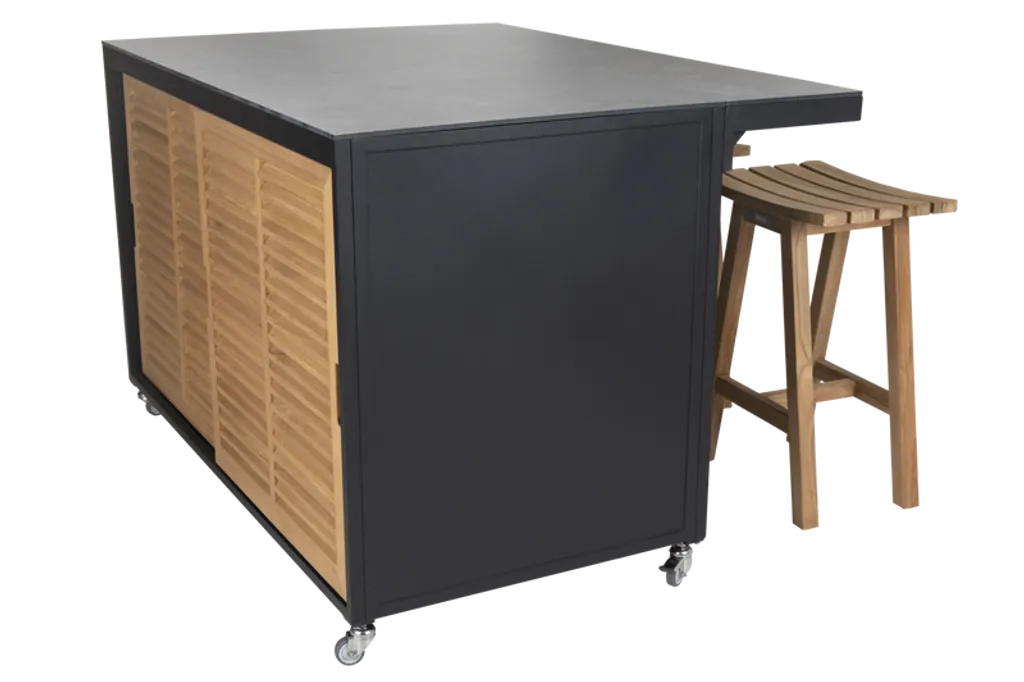 Den robusta konstruktionen i aluminium säkerställer långvarig hållbarhet och styrka. De stilfulla trädetaljerna på dörrarna ger en varm och inbjudande känsla. Tack vare hjulen kan du enkelt flytta köket efter behov.