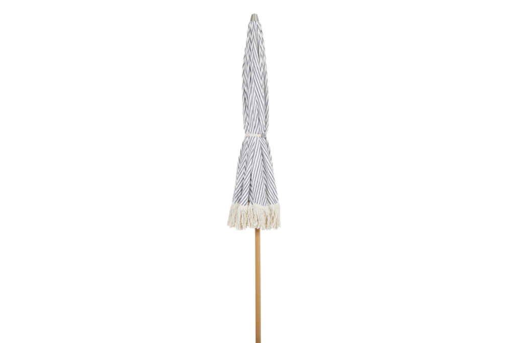 Elegant parasoll i grårandigt mönster, perfekt för stranden och trädgården, med praktisk bärväska.