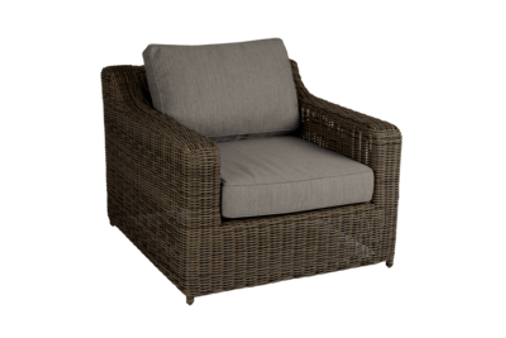 Stilren och bekväm fåtölj i konstrotting med slitstarka dynor. Perfekt för avkopplande stunder utomhus.