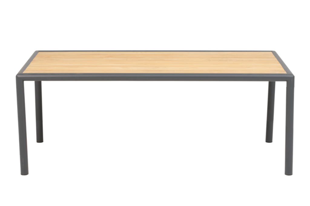 Stilrent soffbord med modern aluminiumram och varm teakskiva, perfekt för uteplatsens loungemiljö.