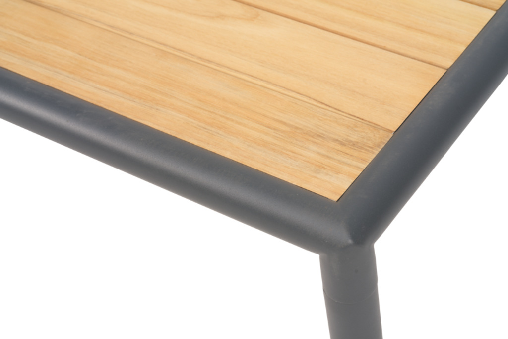 Bordsskivan är tillverkad av teak, vilket tillför en varm och naturlig känsla till designen. Teaken är inte bara vacker utan också praktisk, då den åldras med behag och kräver minimalt underhåll.