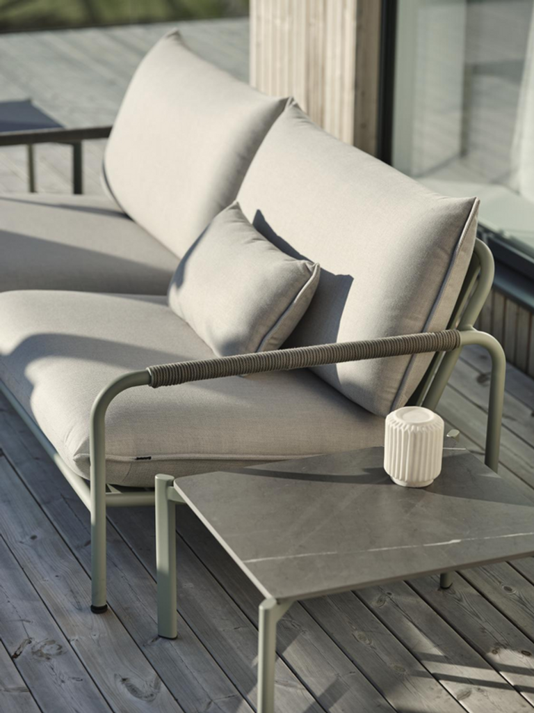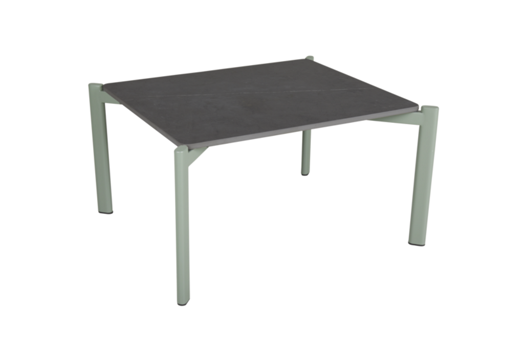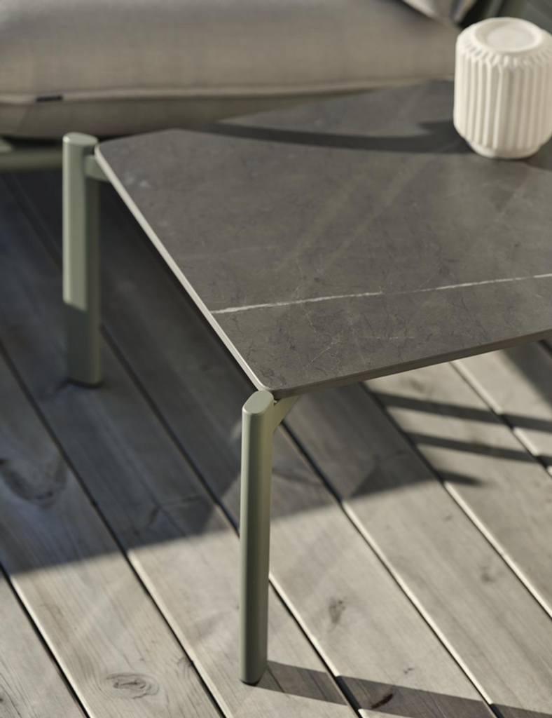 Elegant sidobord i grön kompositsten och aluminium. Perfekt för utomhuslounge.