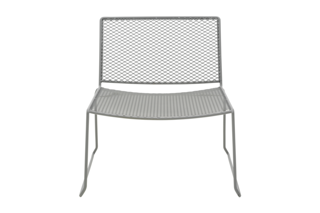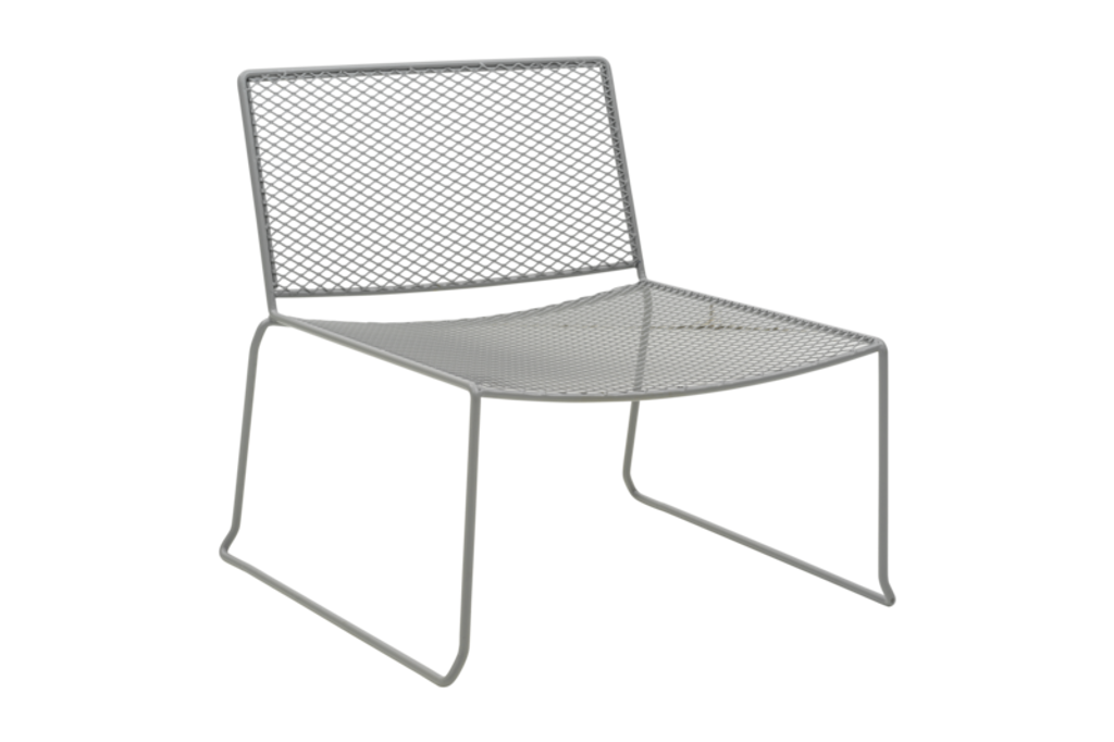 Elegant loungefåtölj i skandinavisk design, tillverkad i Småland av slitstarkt stål med grafiskt sträckmetallmönster.
