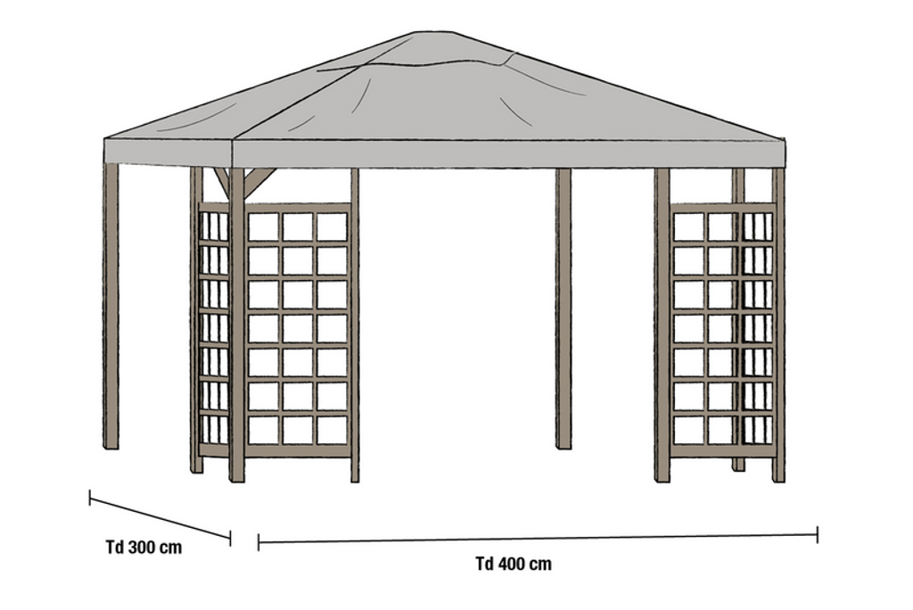 - Mått: Bredd 400 cm, Längd 300 cm, Djup 300 cm.