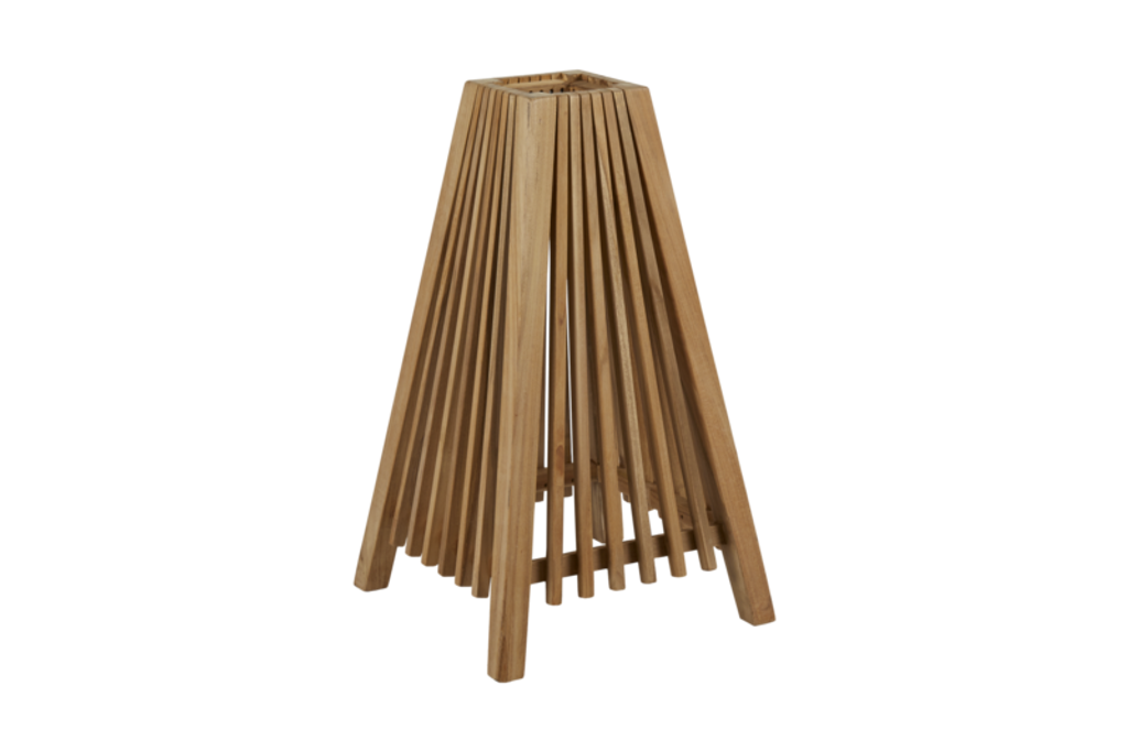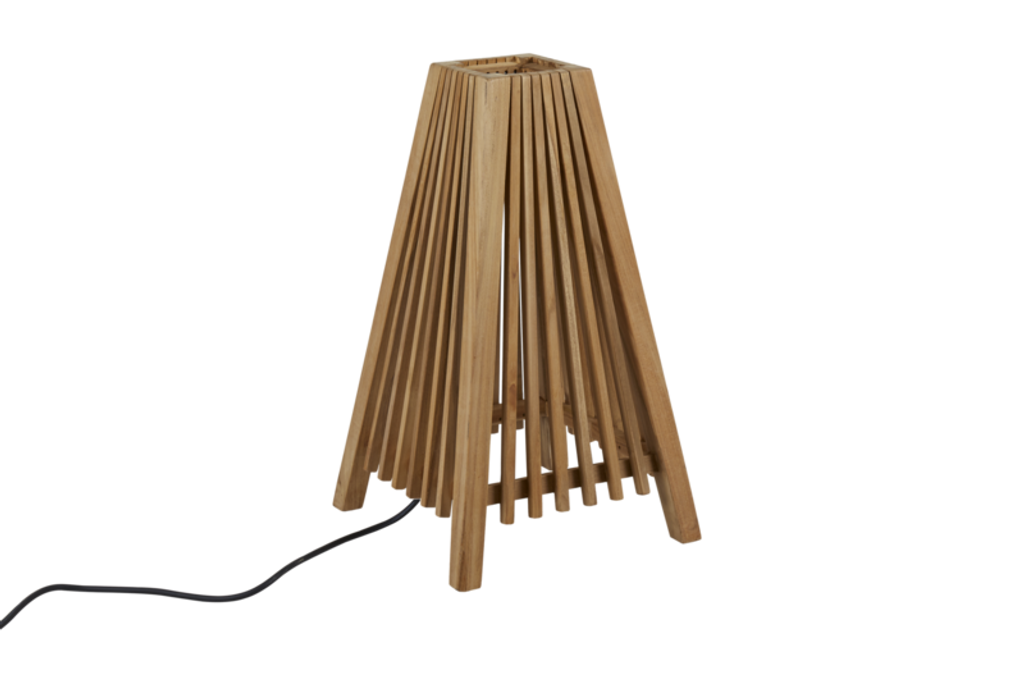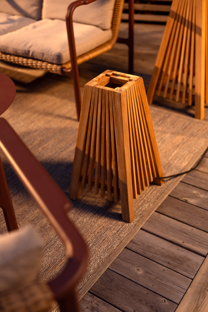 Elegant lampskärm i naturfärgad teak med skandinavisk design för stilfulla uteplatser.