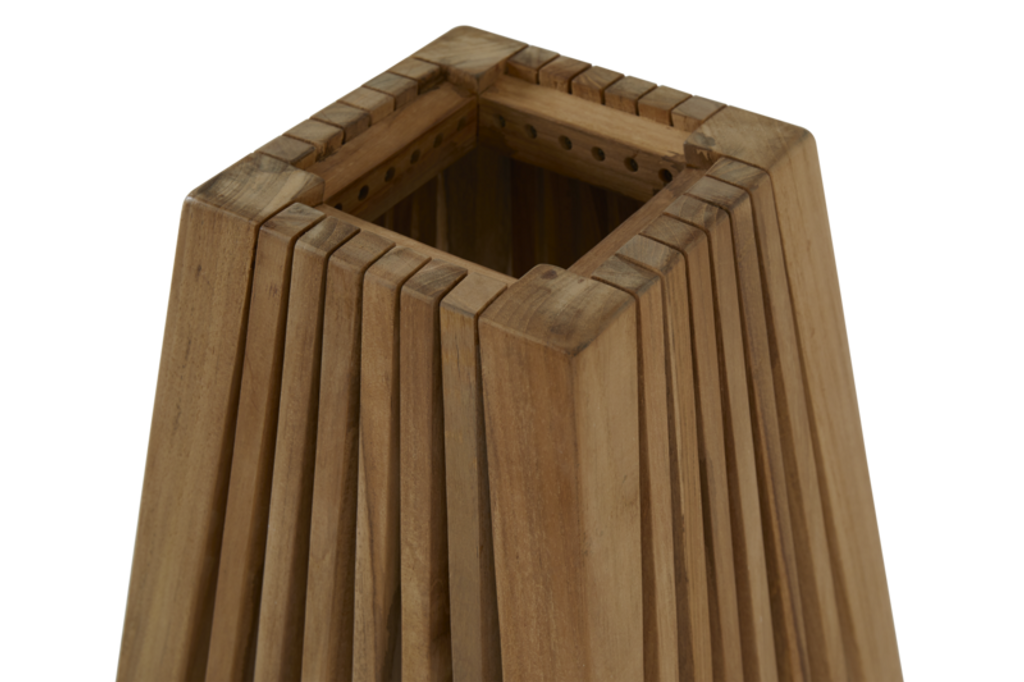 Lampskärmen är tillverkad i teak, vilket gör den både hållbar och estetiskt tilltalande. Den genomtänkta designen erbjuder inte bara visuell skönhet utan även funktionalitet genom sin stabila konstruktion. Träets varma ton och den naturliga strukturen gör att den smälter in i olika miljöer, oavsett om det är på verandan eller i trädgården.