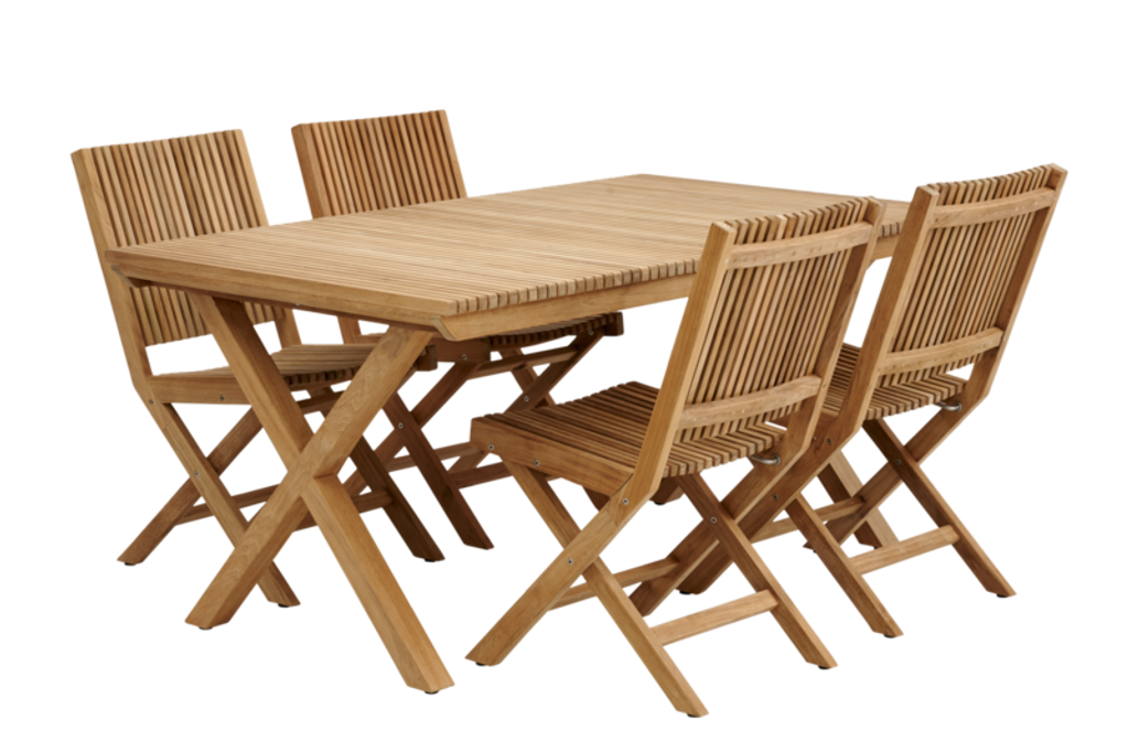 Elegant matbord i teak med skandinavisk design, perfekt för stilmedvetna uteplatser.