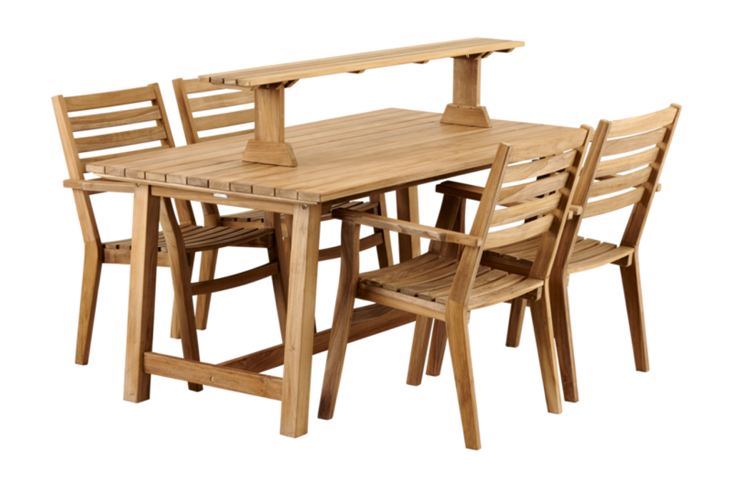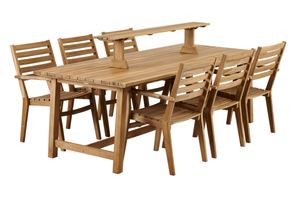 Bordshyllan är tillverkad i högkvalitativ teak, vilket inte bara ger en robust och hållbar struktur, men också en naturligt vacker finish som kompletterar ditt bords estetik. Den ljusa teakträfärgen ger en varm och inbjudande känsla, perfekt för både inomhus- och utomhusbruk.