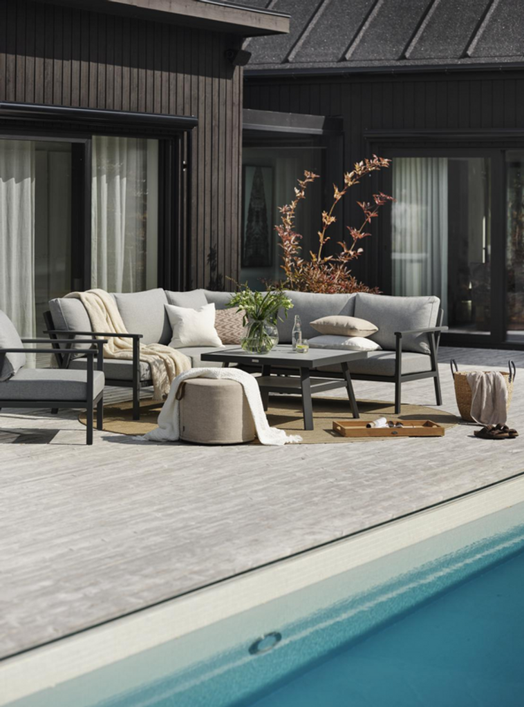 Elegant och tålig sittpuff med olefintyg och läderhandtag, perfekt för flexibla sittplatser utomhus.