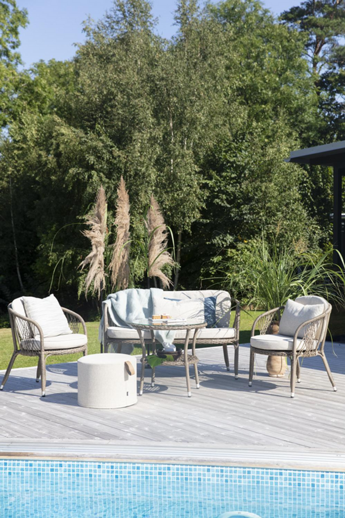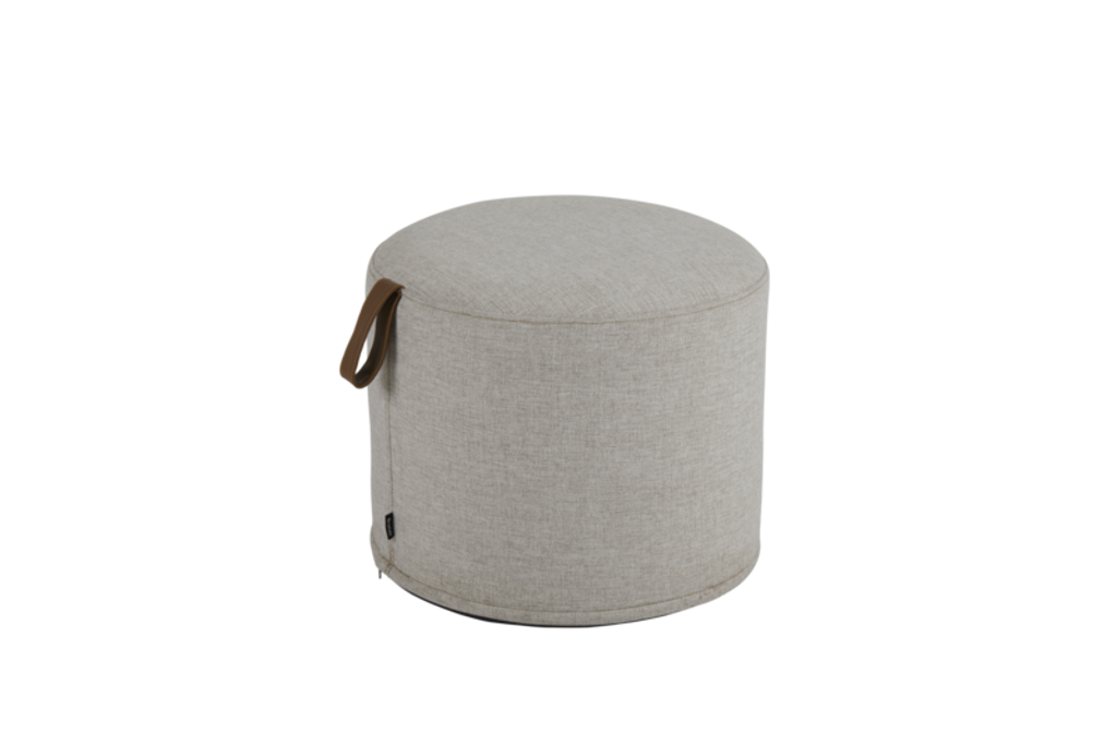 Sittpuffen är klädd i ett elegant beige tyg som smälter väl in i olika utomhusmiljöer. Den rundade formen och de generösa måtten (Ø 50 cm, H 40 cm) erbjuder en bekväm extra sittplats, perfekt för trädgårdssammankomster eller avkoppling i solen.