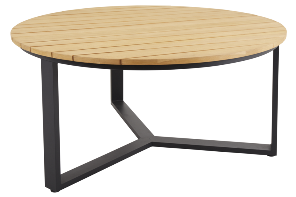 Elegant runt matbord i teak och svart aluminium, perfekt för sociala utomhusmiddagar med plats för 6 personer.