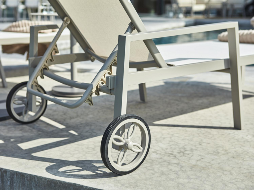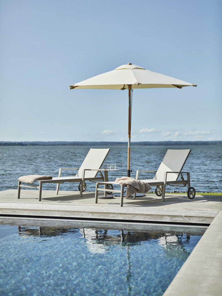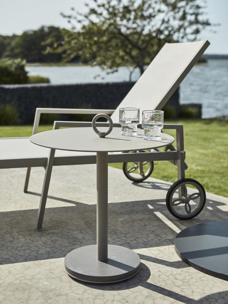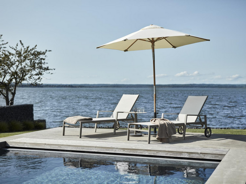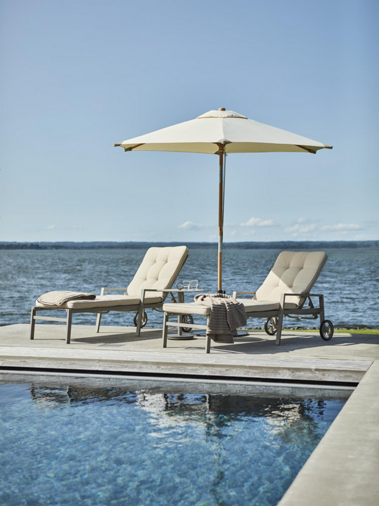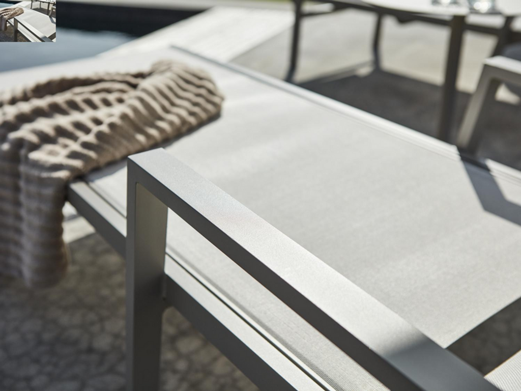 Stilren vilsäng i pulverlackerad aluminium med olefindynor, perfekt för din moderna uteplats.