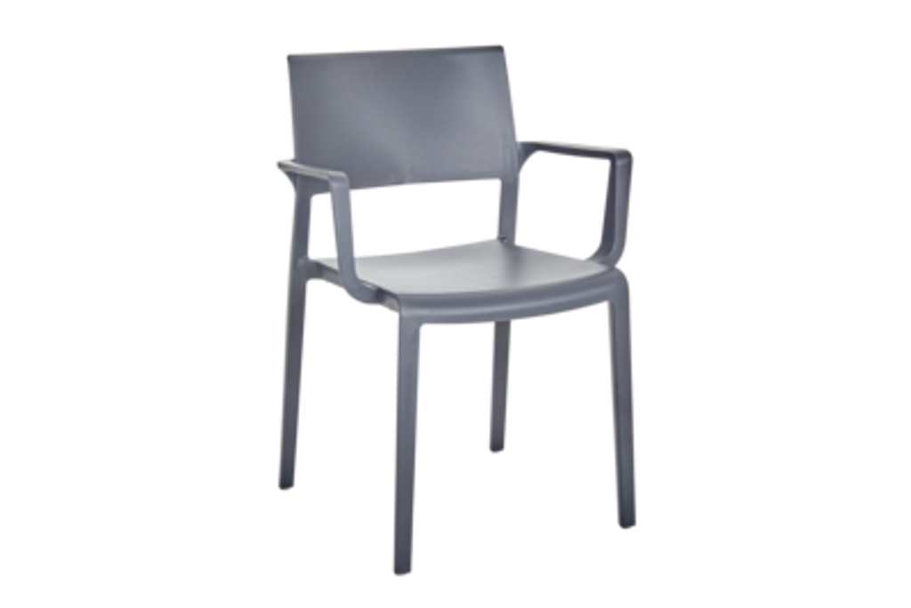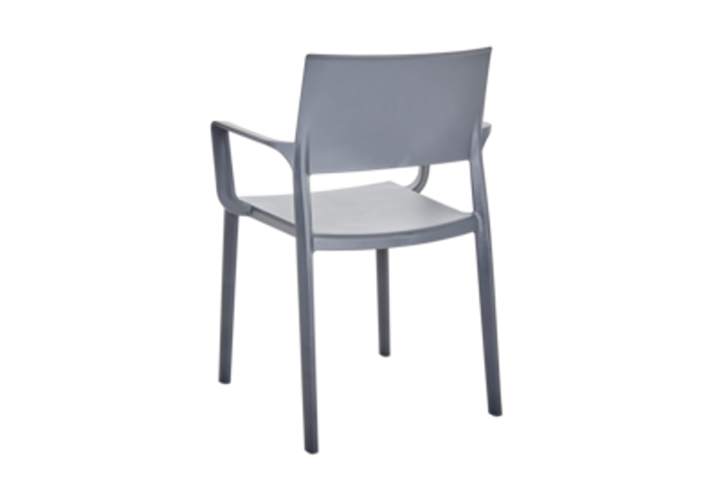Den minimalistiska grå färgen ger en sofistikerad touch till ditt matrum eller uteplats. Armstöden ger extra komfort, vilket gör den perfekt för långa middagar eller avkopplande stunder i solen.