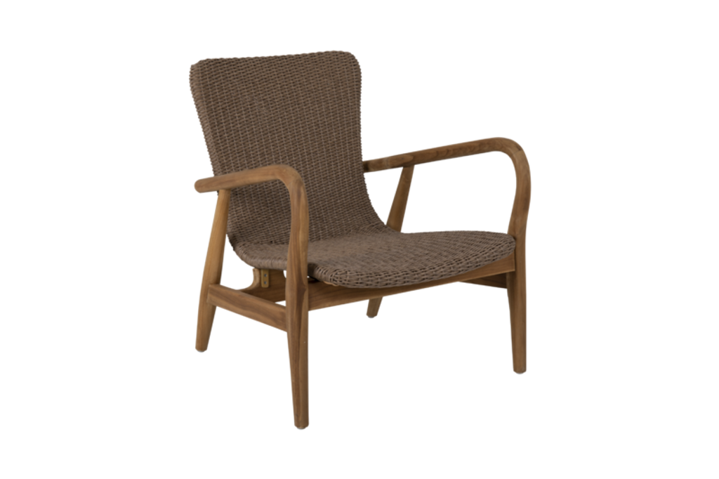 Elegant fåtölj i organiska former med sandfärgat olefintyg och robust teakram, perfekt för både avkoppling och måltider.