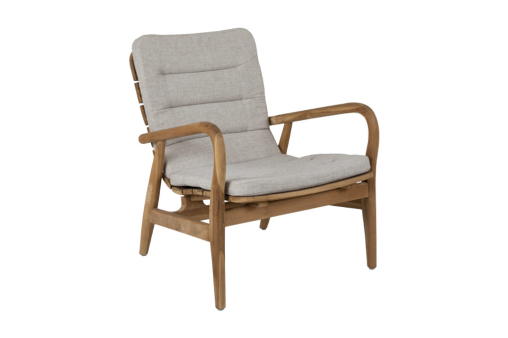 Elegant loungefåtölj i naturfärgad teak med bekväma sandfärgade dynor för avkoppling och stil.