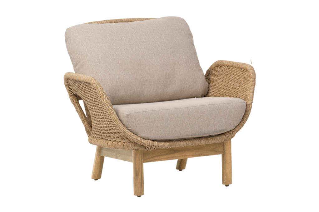 Elegant fåtölj med twistad konstrotting och teakben, perfekt för avslappnad lyx på uteplatsen.