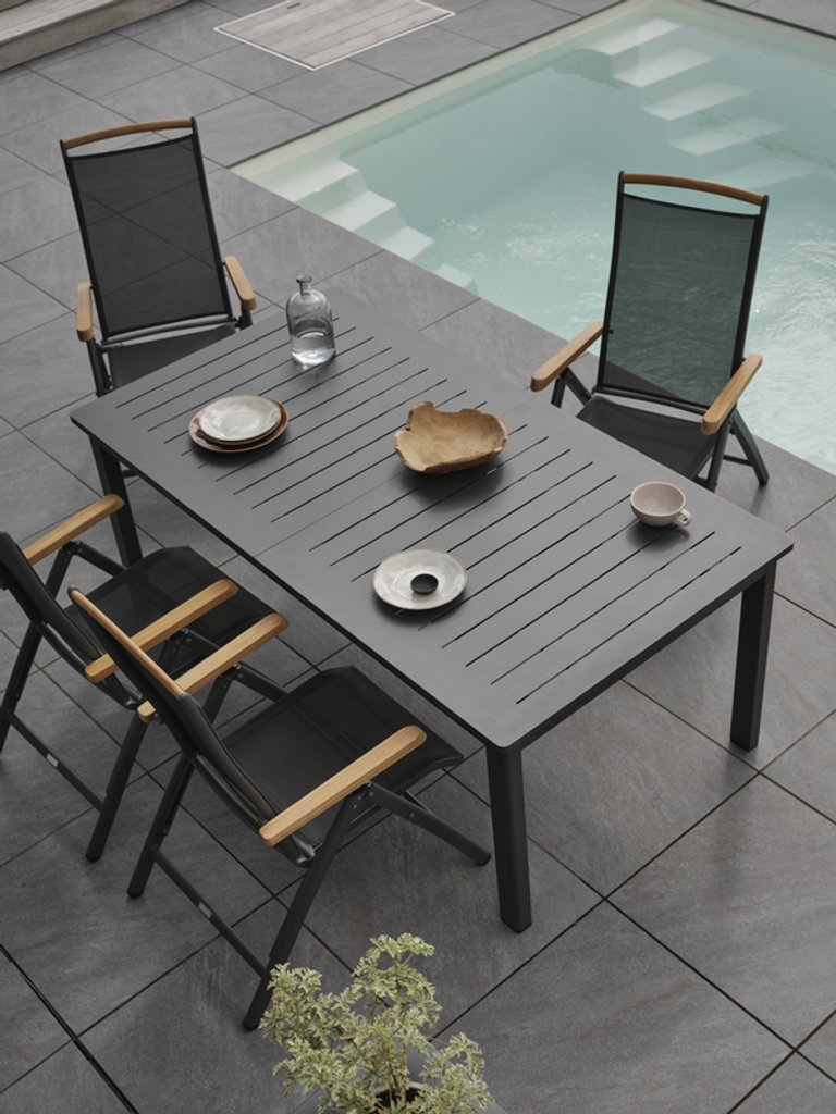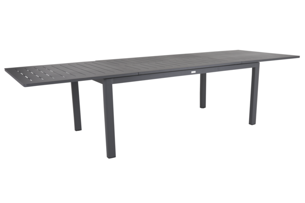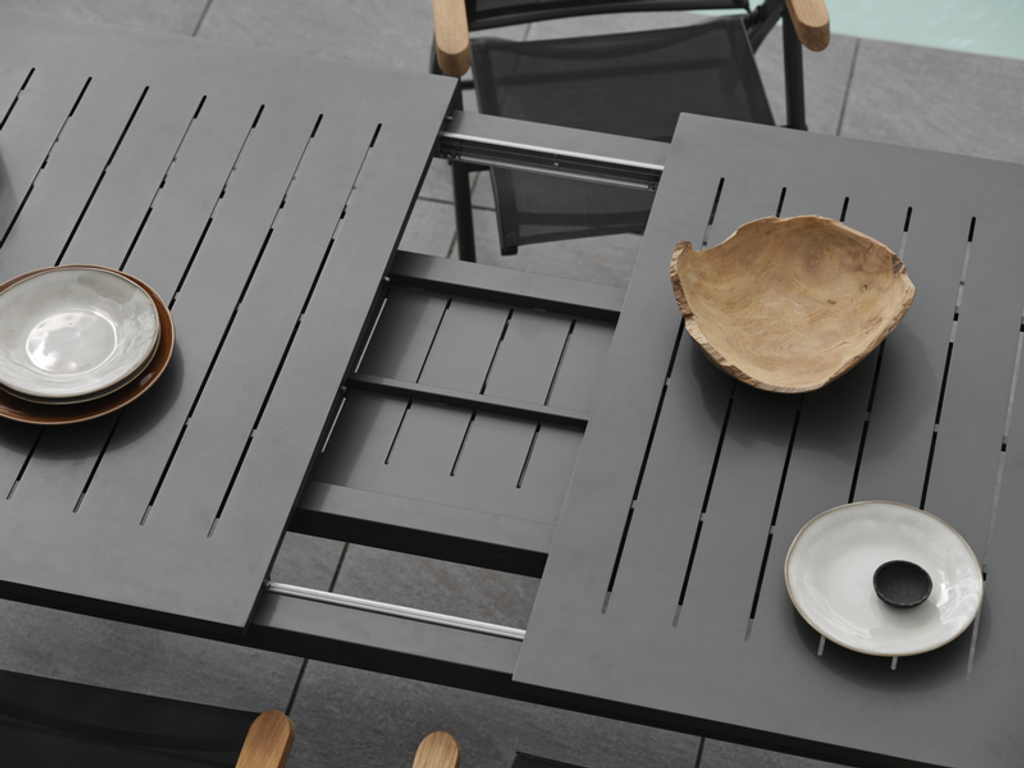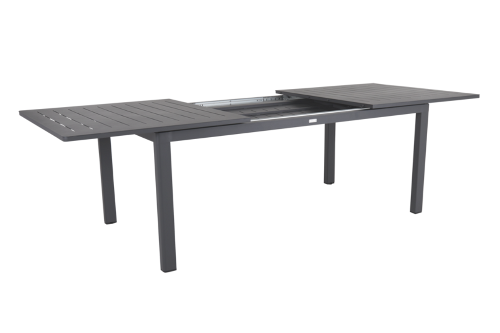 Elegant och funktionellt förlängningsbart matbord i antracit aluminium, perfekt för utomhusmiljöer.