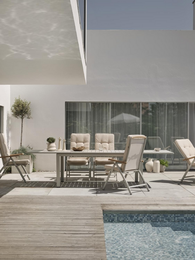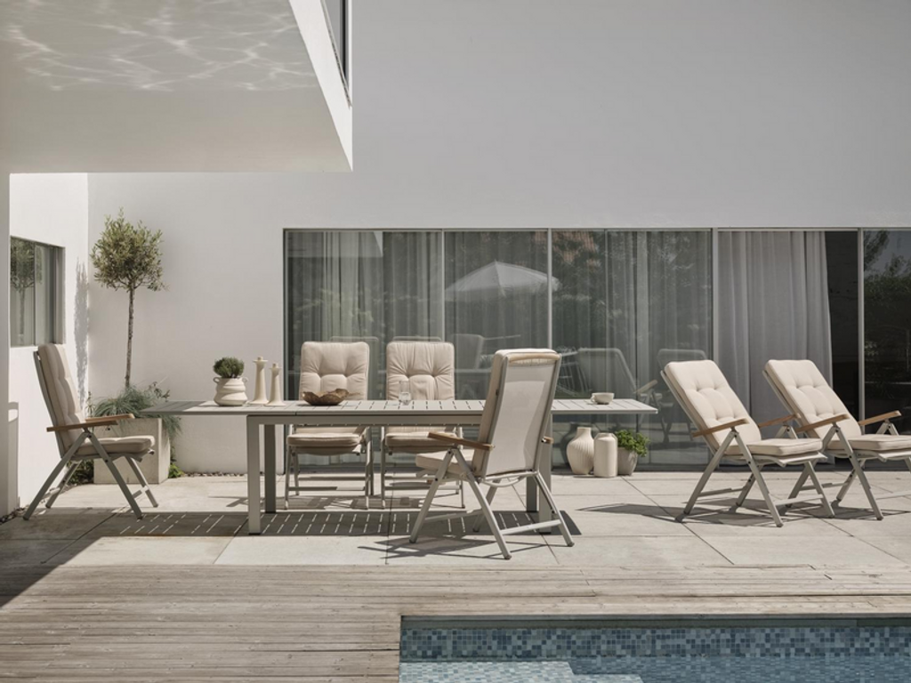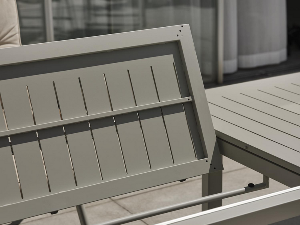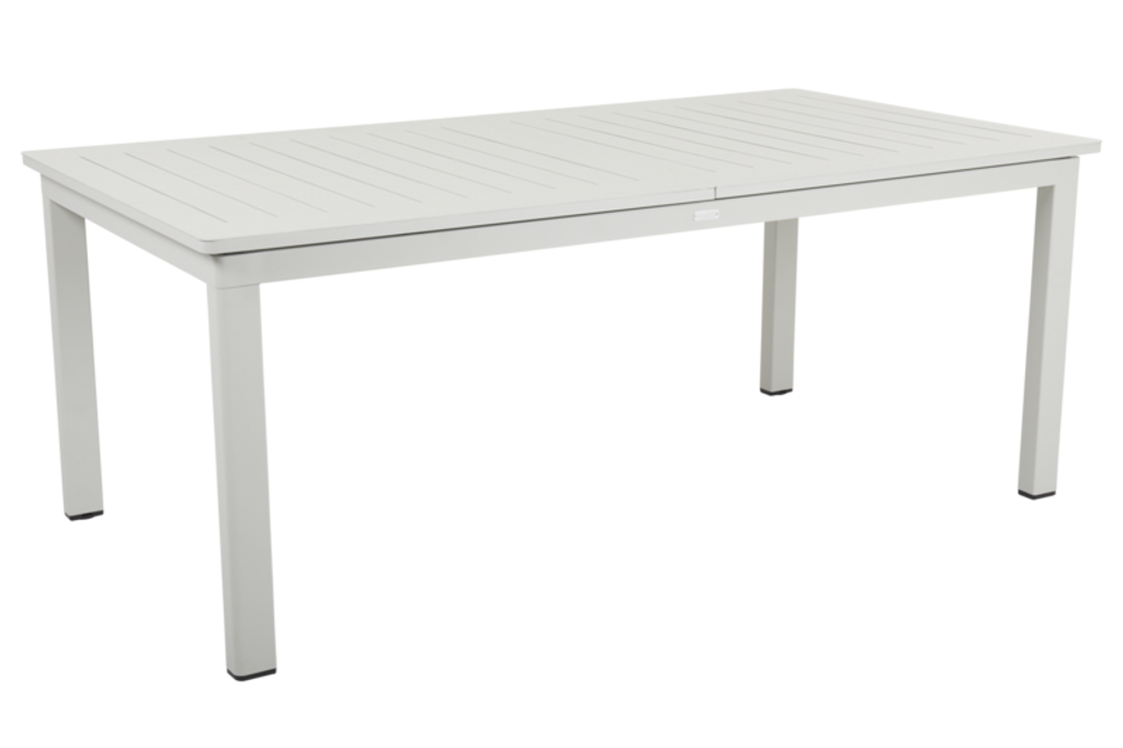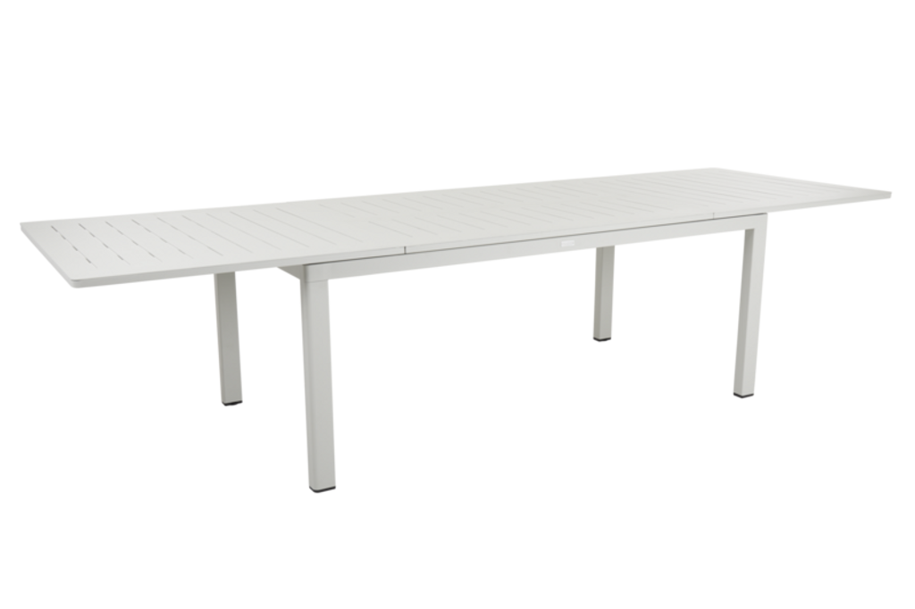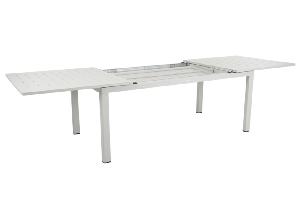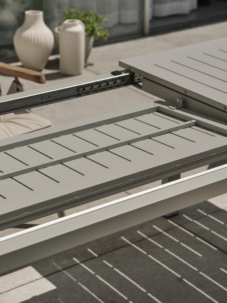 Den ljusgrå aluminiumkonstruktionen garanterar ett lätt men ändå tåligt bord som står emot väder och vind. Den förlängningsbara skivan ger dig möjlighet att enkelt justera storleken från 194 cm till hela 312 cm, vilket gör det enkelt att anpassa bordet efter antalet gäster.