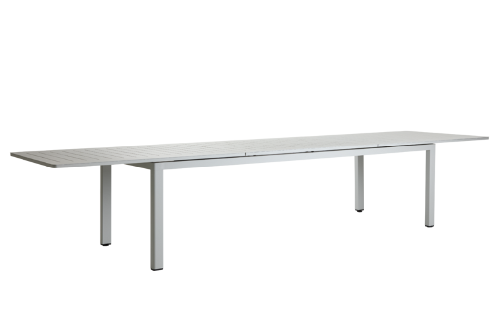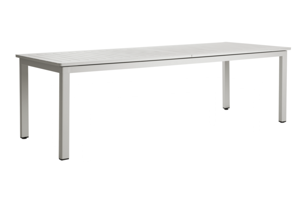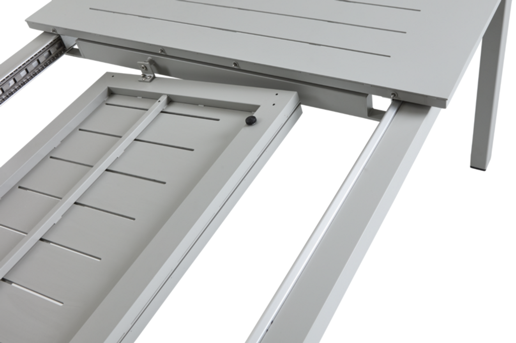 Elegant aluminiumbord med ribbmönster och smart Butterfly-funktion, utökar från 260 till 380 cm.