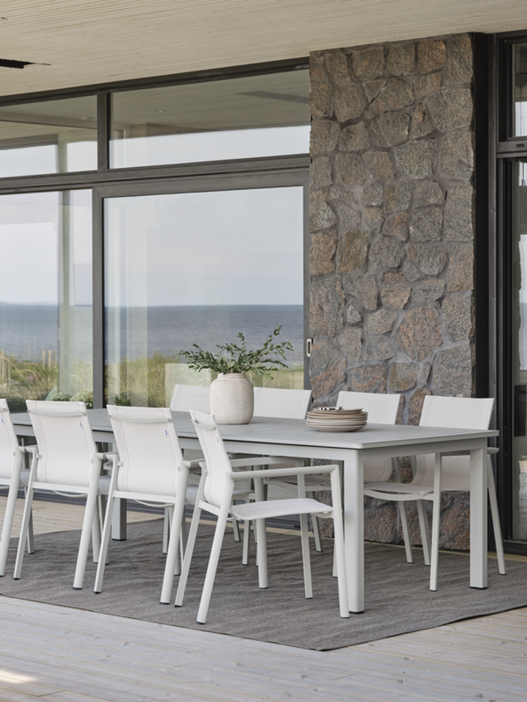 Brafab Lomma matbord är ett mästerverk i skandinavisk design, tillverkat för att kombinera elegans och funktionalitet. Med sin ljusgrå färg och stilfulla ribbmönster i aluminium, blir det en tidlös del av din utomhusmiljö. Den smarta Butterfly-funktionen gör det enkelt att förlänga bordet från 260 cm till hela 380 cm, vilket ger generös plats för både vardagliga middagar och festliga tillfällen.