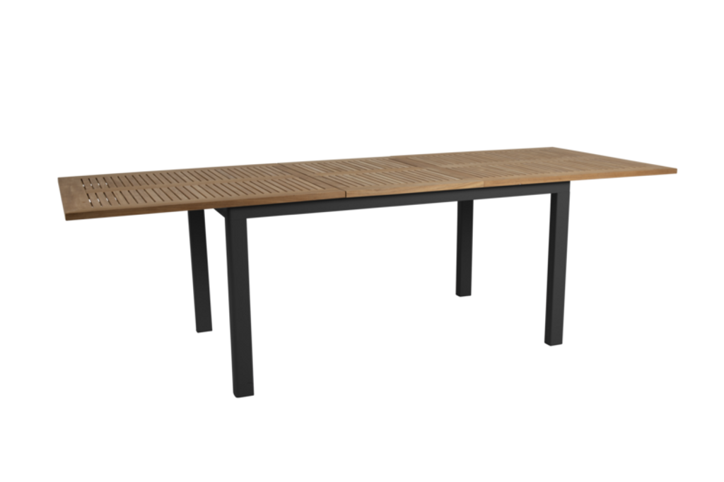 Stilrent matbord med förlängningsbar butterflyskiva i lackerad aluminium och teak. Perfekt för både mindre och större sällskap.