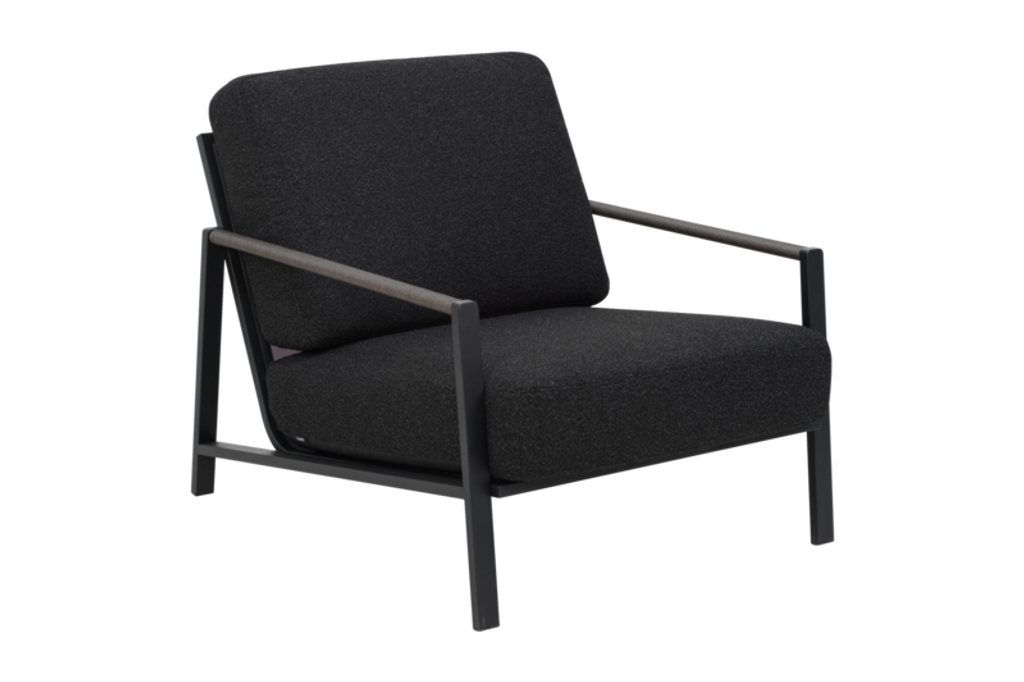 Lyra loungefåtölj från Brafab erbjuder modern design och hög komfort med tjocka dynor och konstrottingdetaljer.